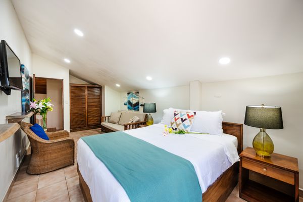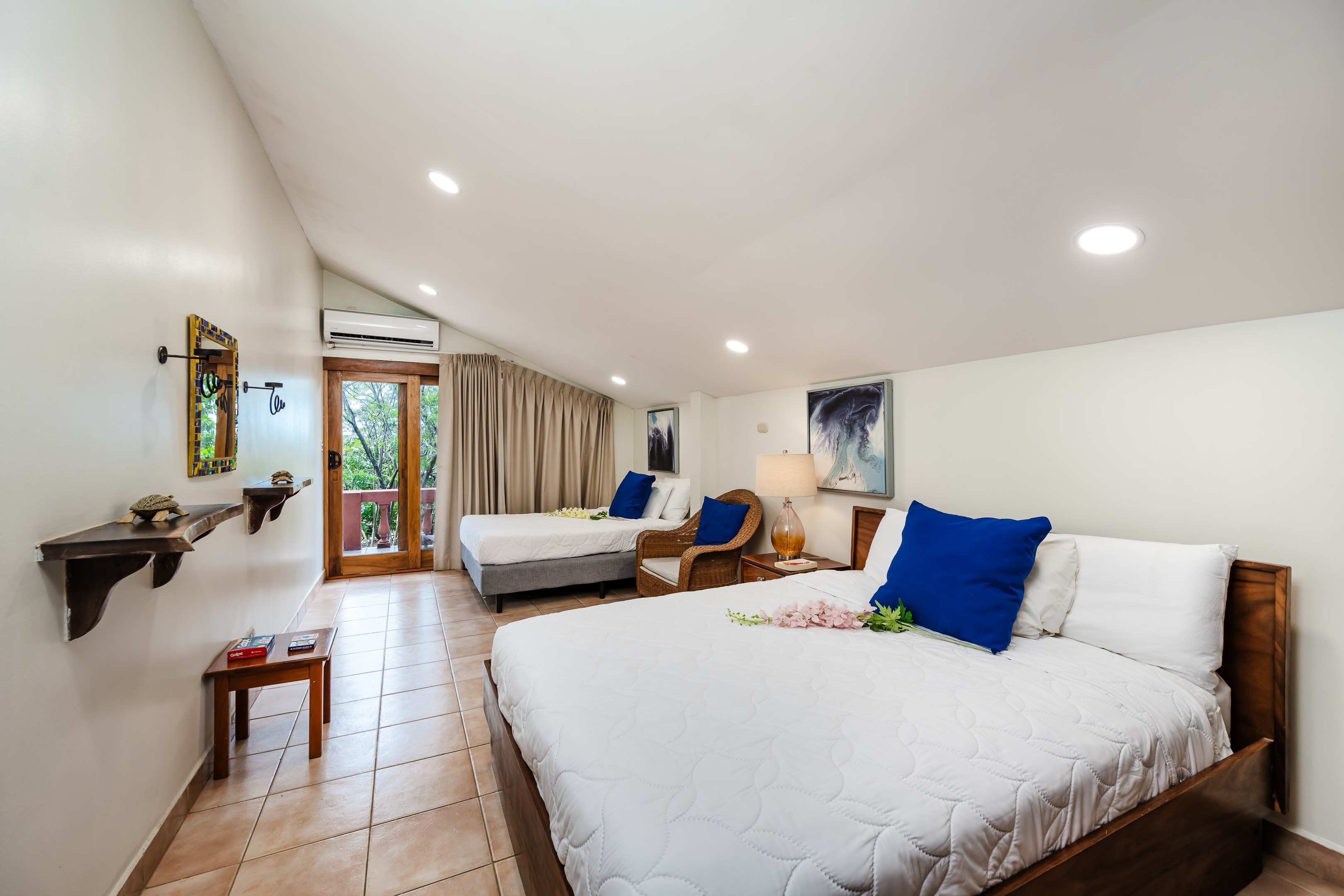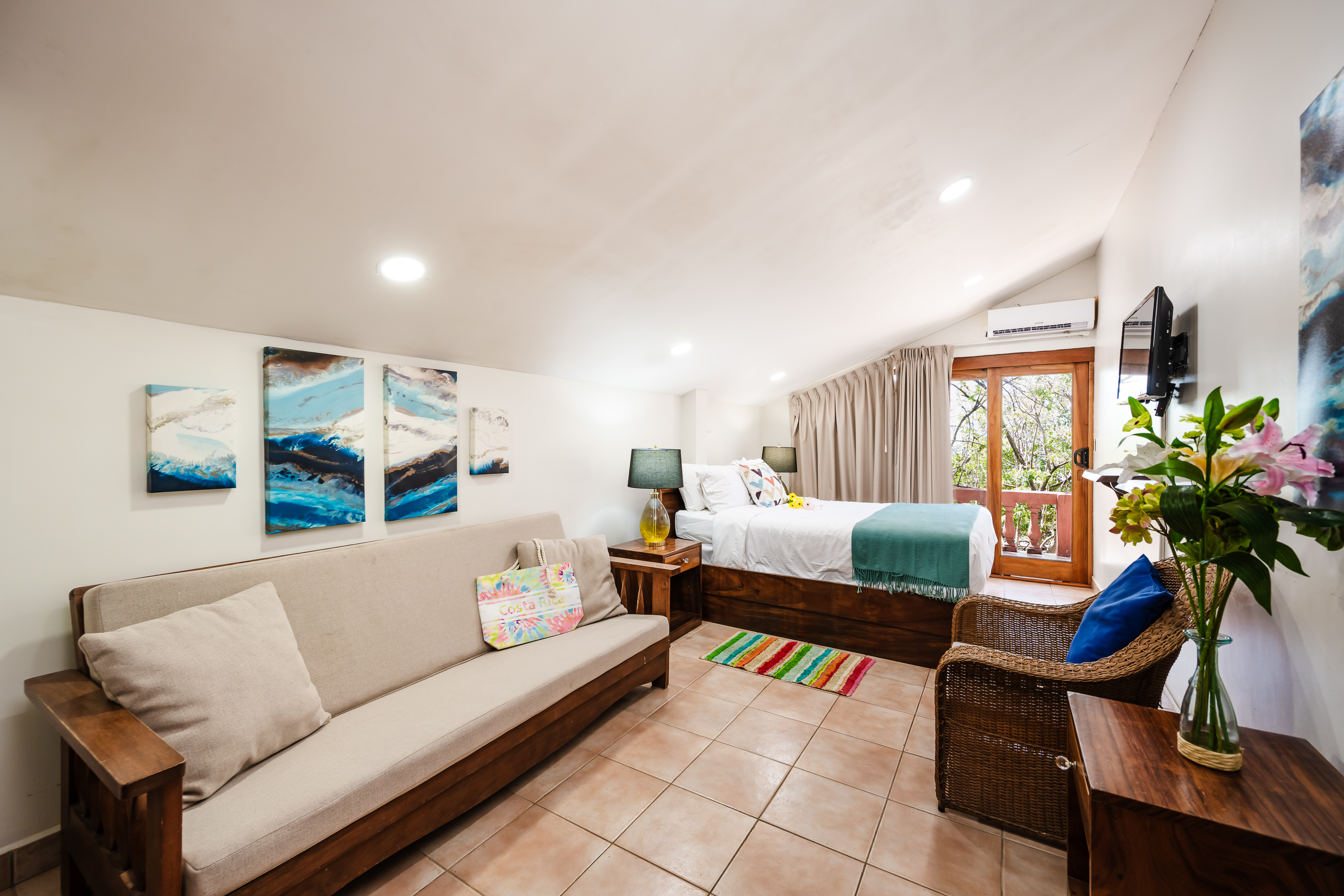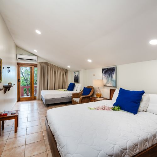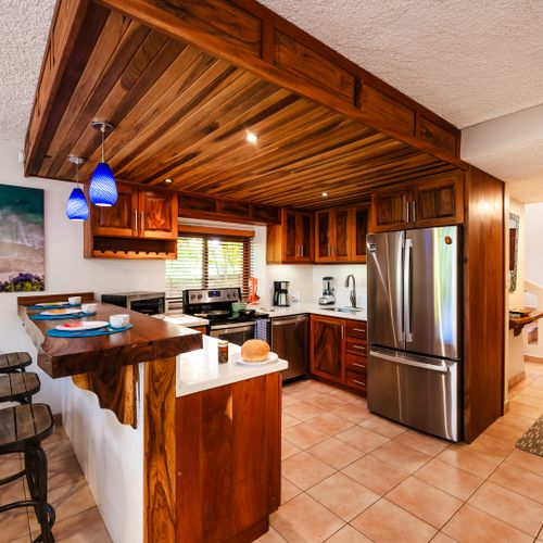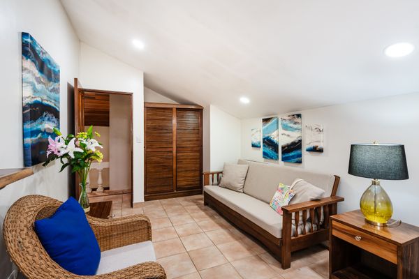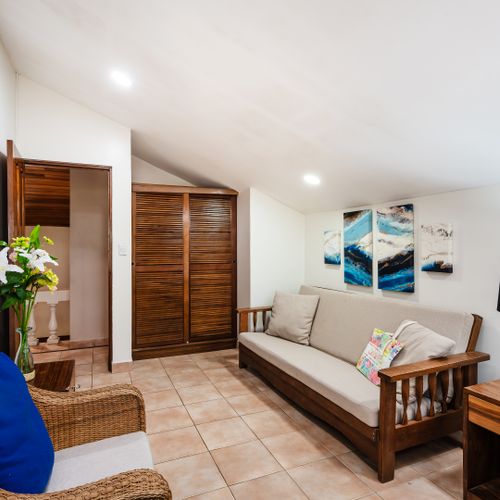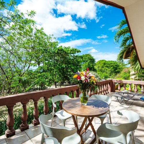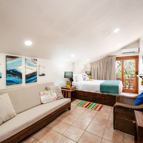 This 1,600 SqFt Beach Front Cottage on Langosta Beach and is part of Villas Langosta Community, an 11-unit complex located right on the beach. The 1st floor features a full quartz kitchen, well acquainted living room with a 65” flat screen TV, a nice dining area, dining patio, and upgraded bathroom. The primary bedroom on the first floor is acquainted with a queen-sized bed, and large flat screened TV. On the second floor, you will find 2 spacious bedrooms; One with a king-sized bed, TV and futon. The other bedroom offers a queen-sized, and full-sized bed with extra living space. Also, there is a shared full-sized bathroom. Both rooms share an amazing full-sized patio overlooking the beach and floral forest canopy.