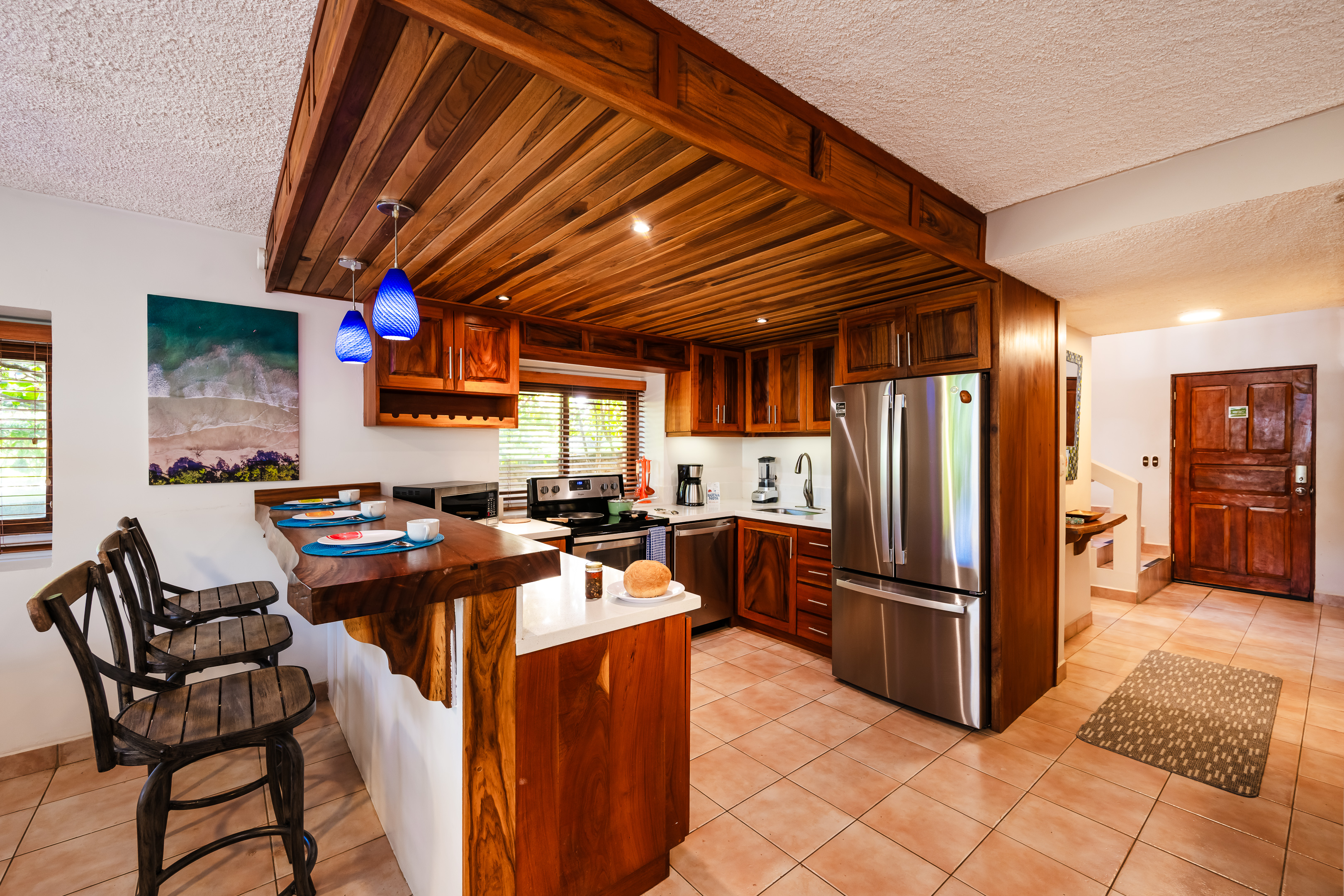 Great location away from the hustle and bustle of Tamarindo unless that is your thing. Property is steps away from the beach, however, it is a rocky beach and you can't swim right there. You have to walk or drive to a safer swimming beach. The property itself is well maintained both inside and out. Appliances are great, air conditioning works, and kitchen is well stocked with everything needed for cooking. Staff is friendly and helpful. Would recommend "La Kitchen" for eating out. There is a little corner store right across the street if needed but there are several larger supermarkets right in Tamarindo. Would highly recommend! Hoping to return someday.