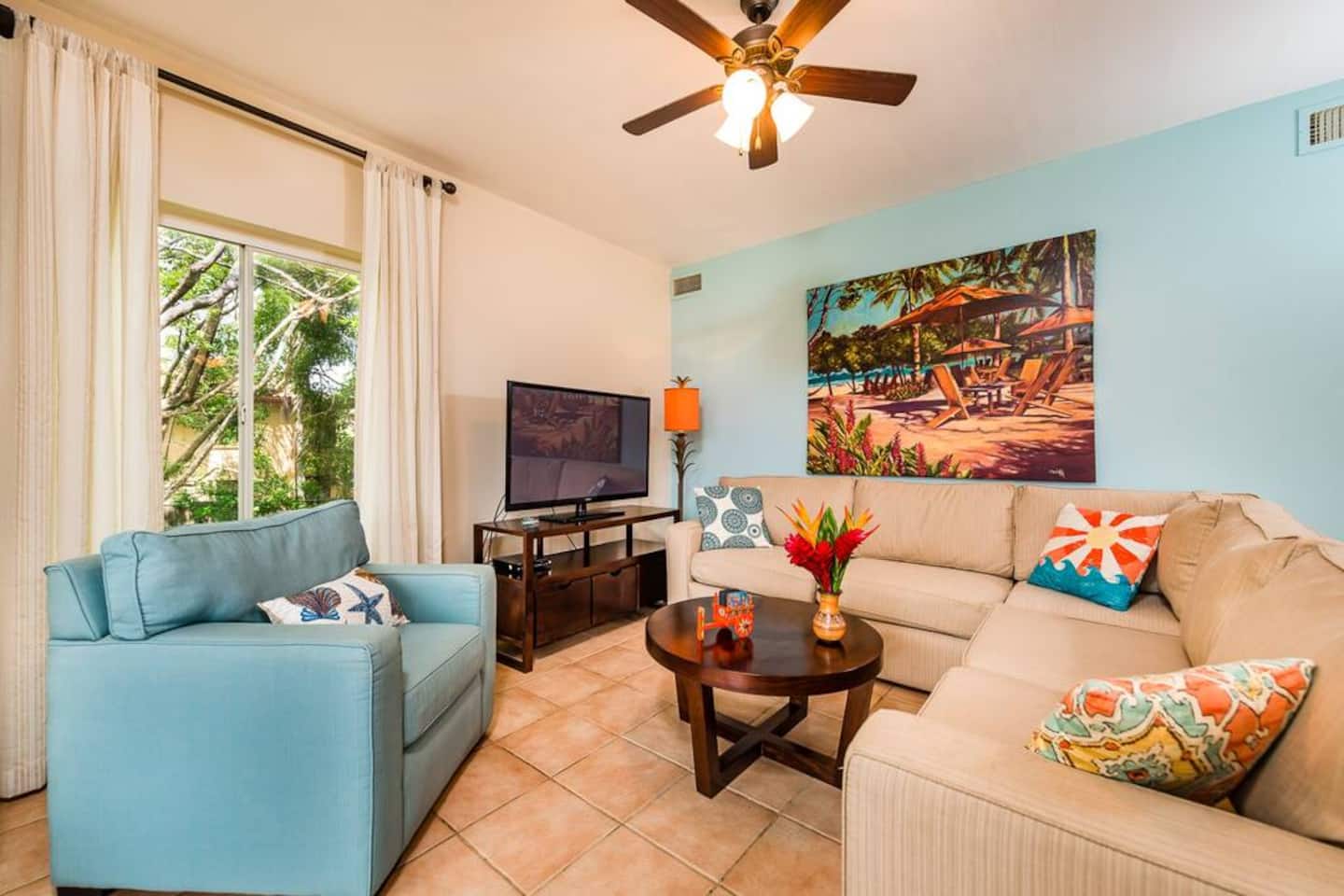 The living room has plenty of comfortable seating and large TV, which connects to the terrace through sliding doors, perfect for BBQs!