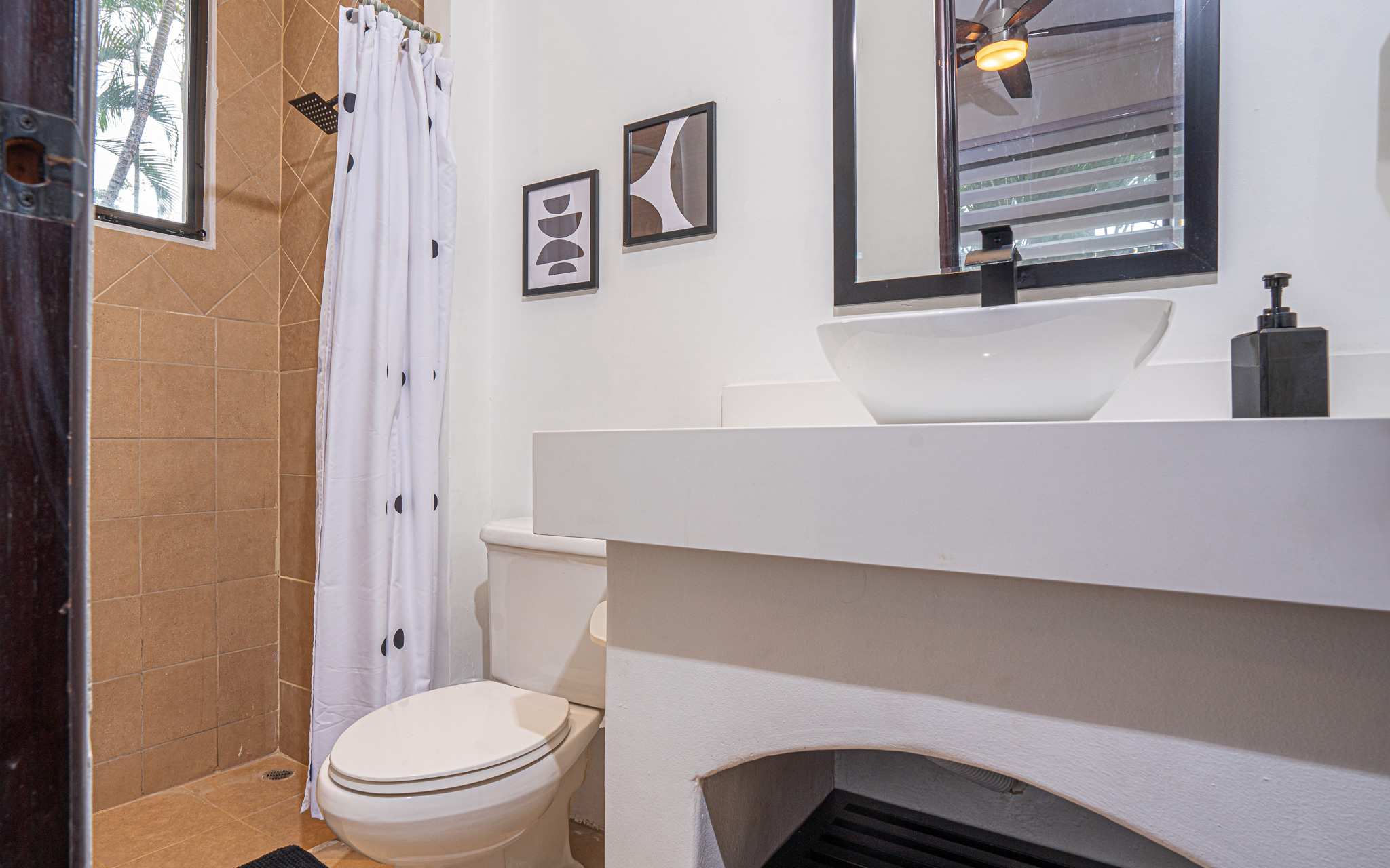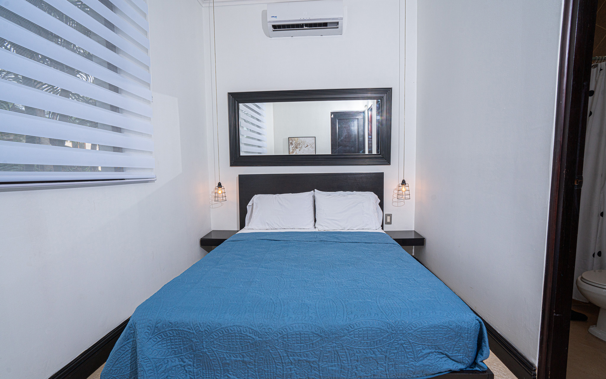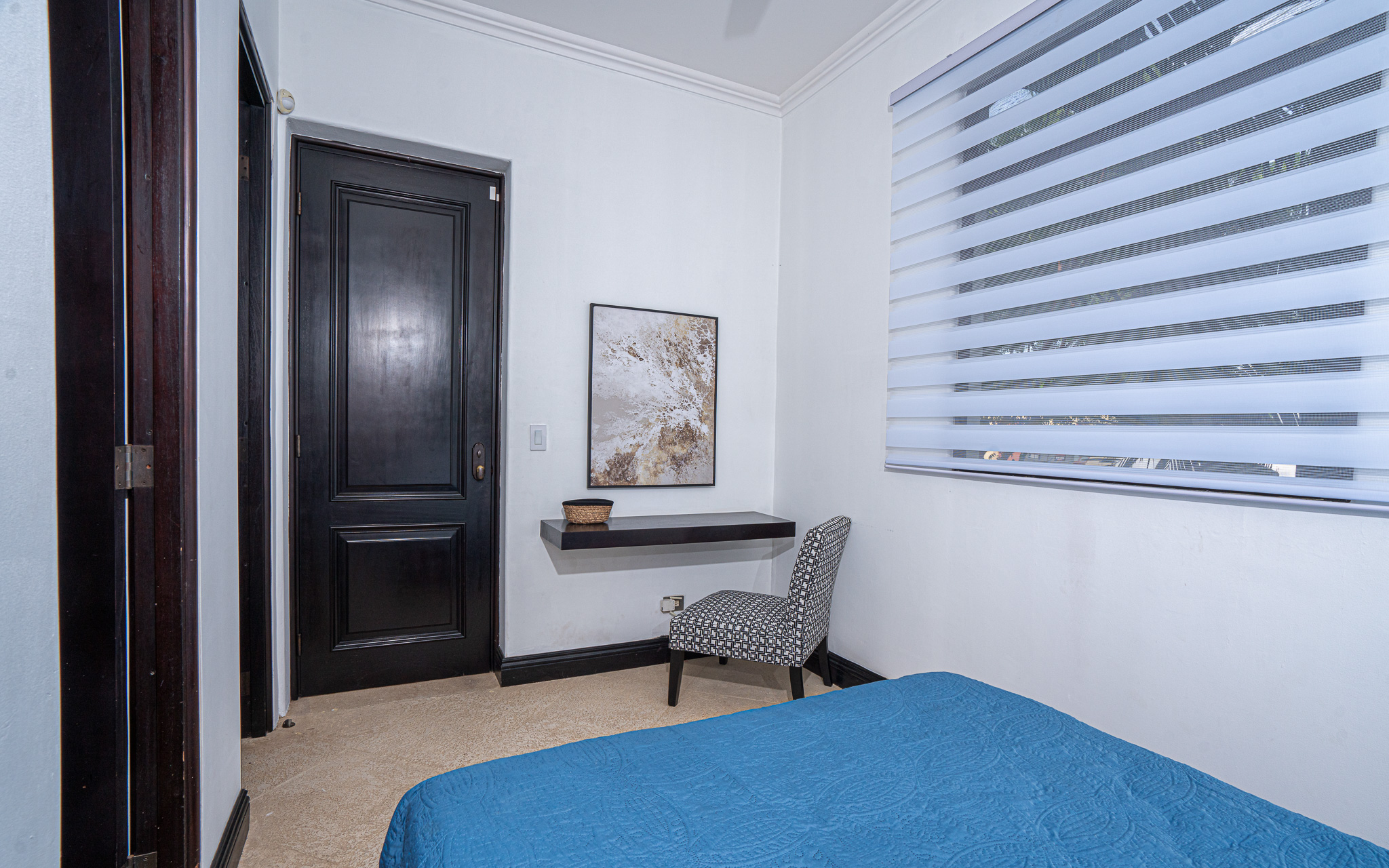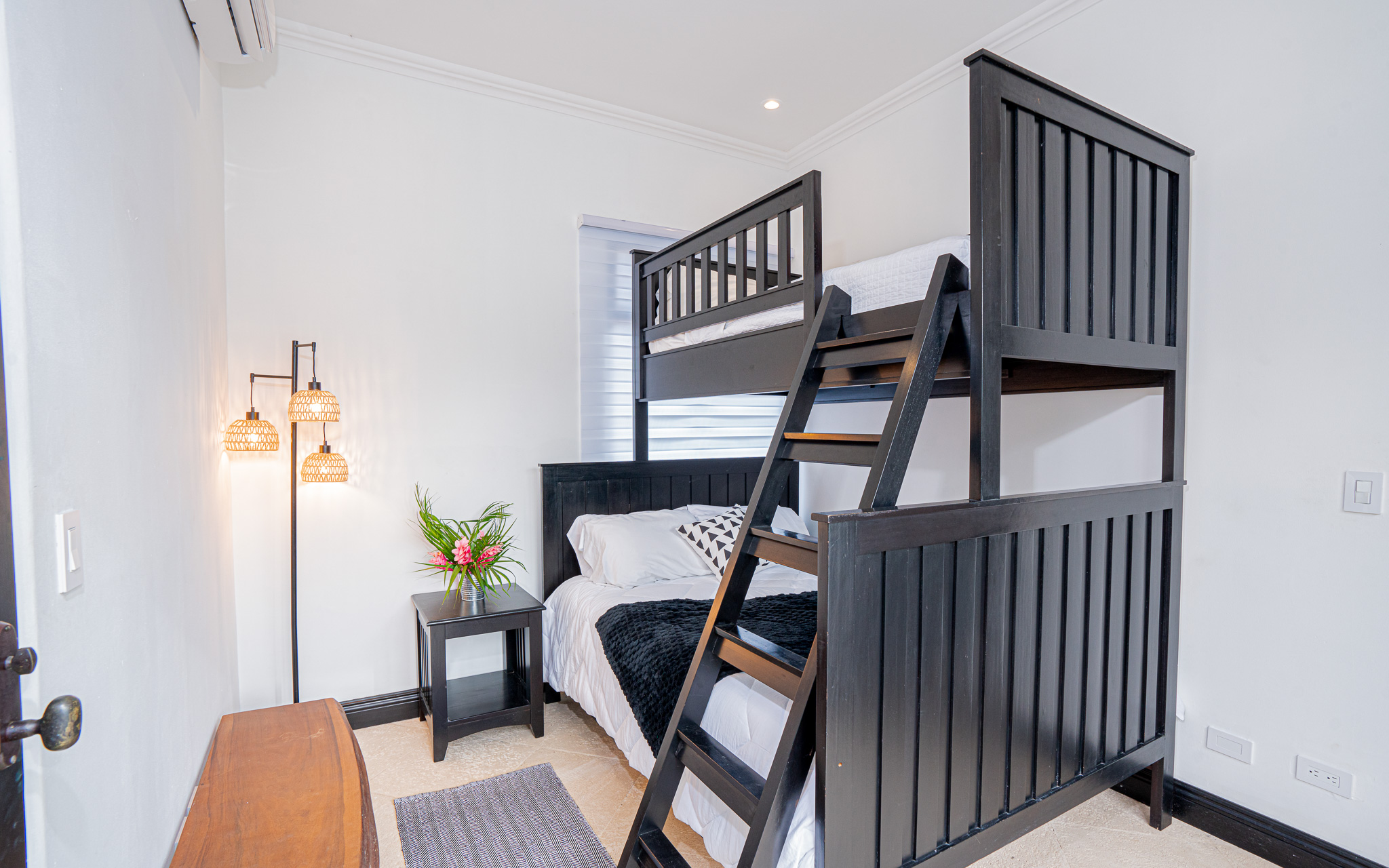 On the second floor you will find another master bedroom with a king size bed, ensuite bathroom, closet, flat screen TV and a large outdoor terrace overlooking the pool. The patio is shared with the third bedroom. This bedroom has a large bunk bed that has a twin and a queen mattress that accommodates 3 adults. The 4th bedroom is separated from the main house and is located at the entrance to the property. It has a queen size bed, full en suite bathroom, office desk, AC, ceiling fan and is also equipped with an alarm system. This bedroom does not have a TV.