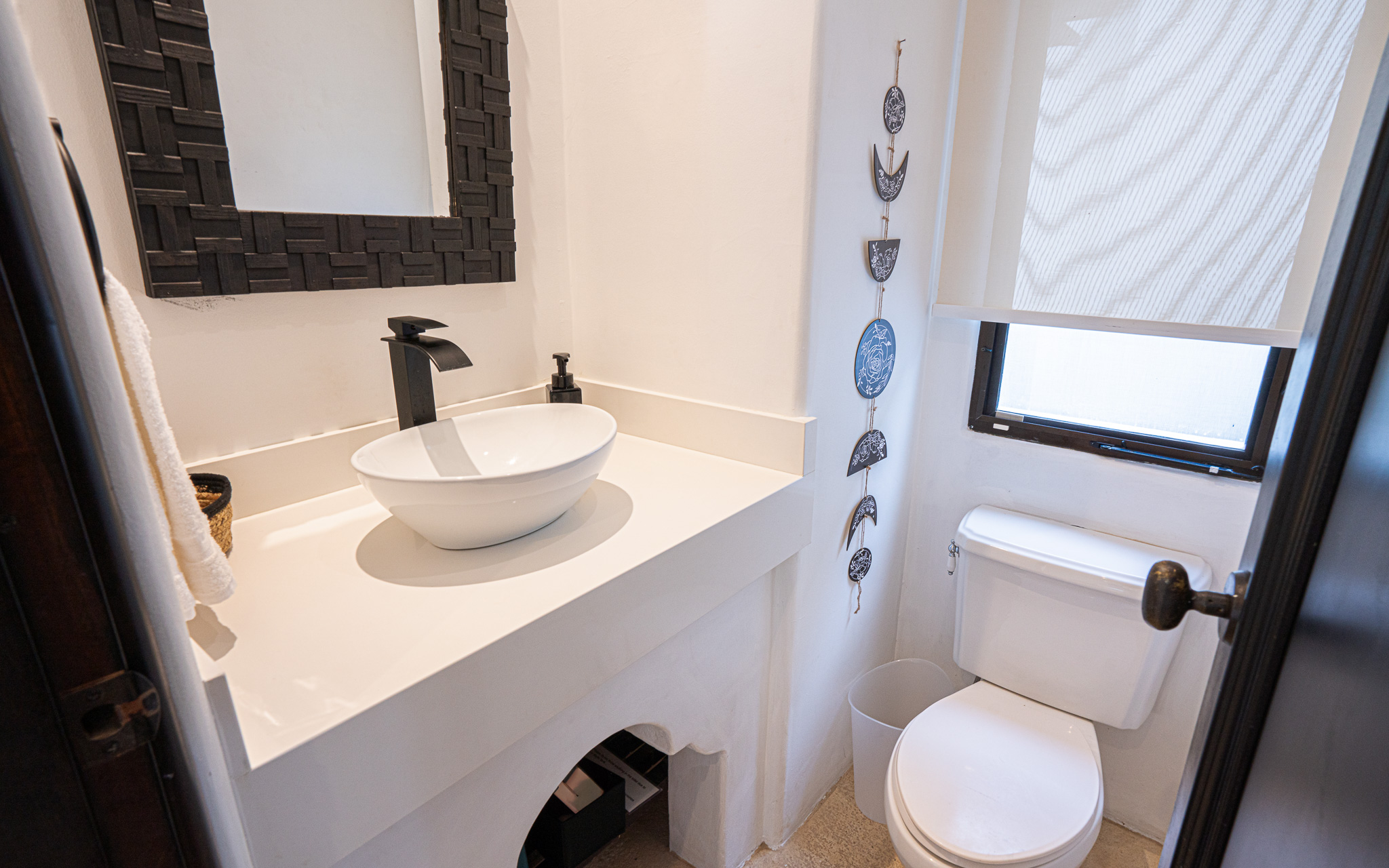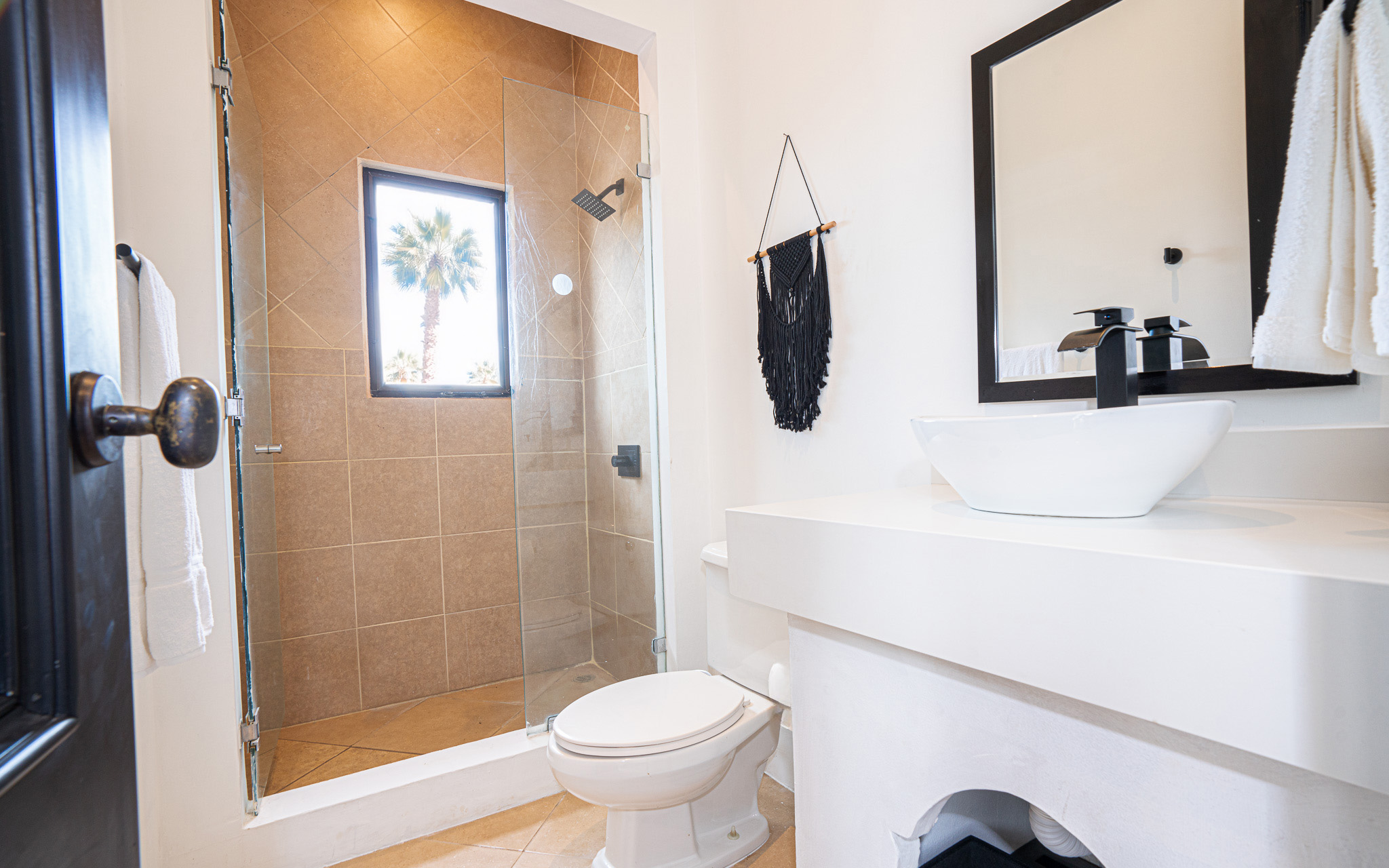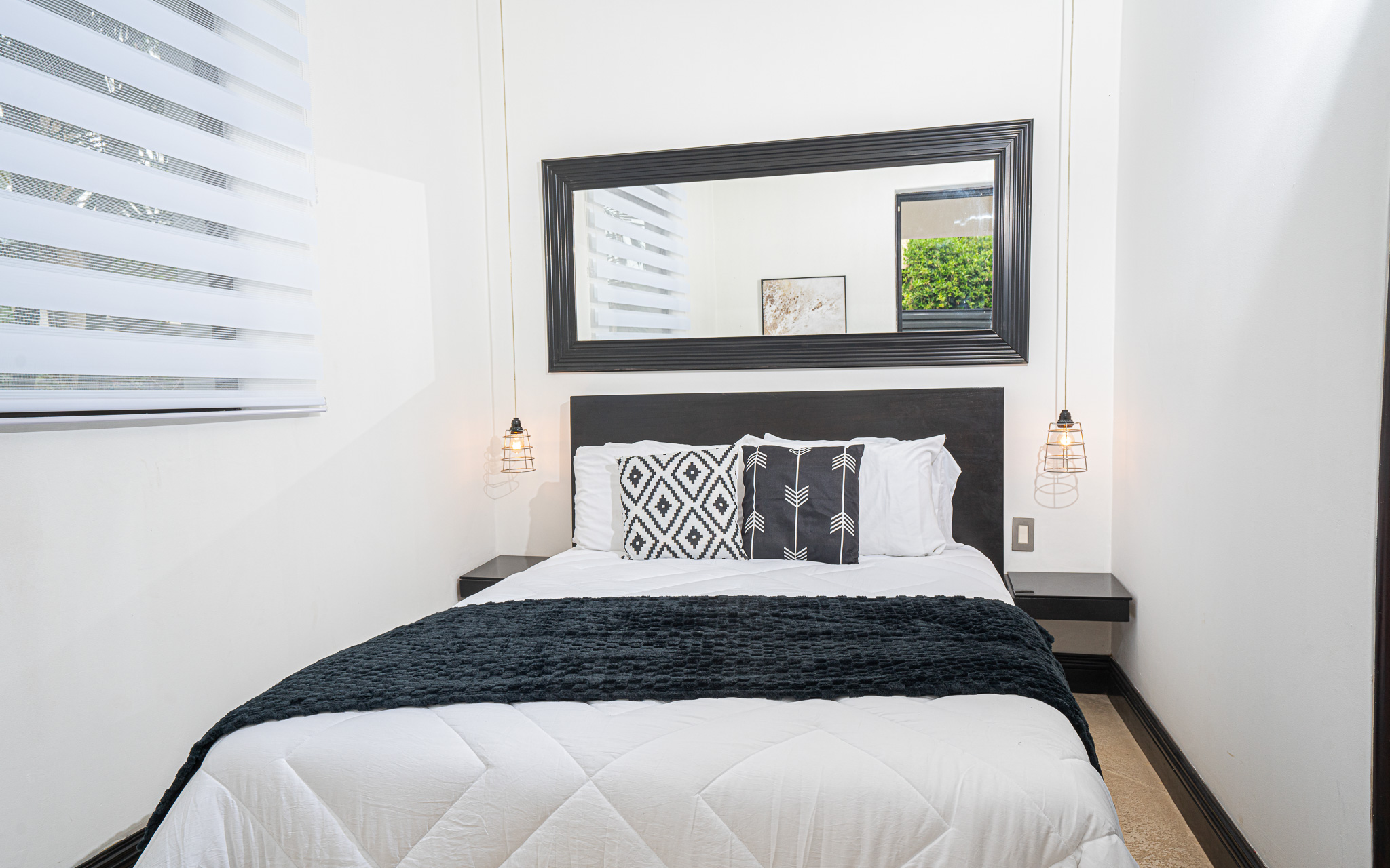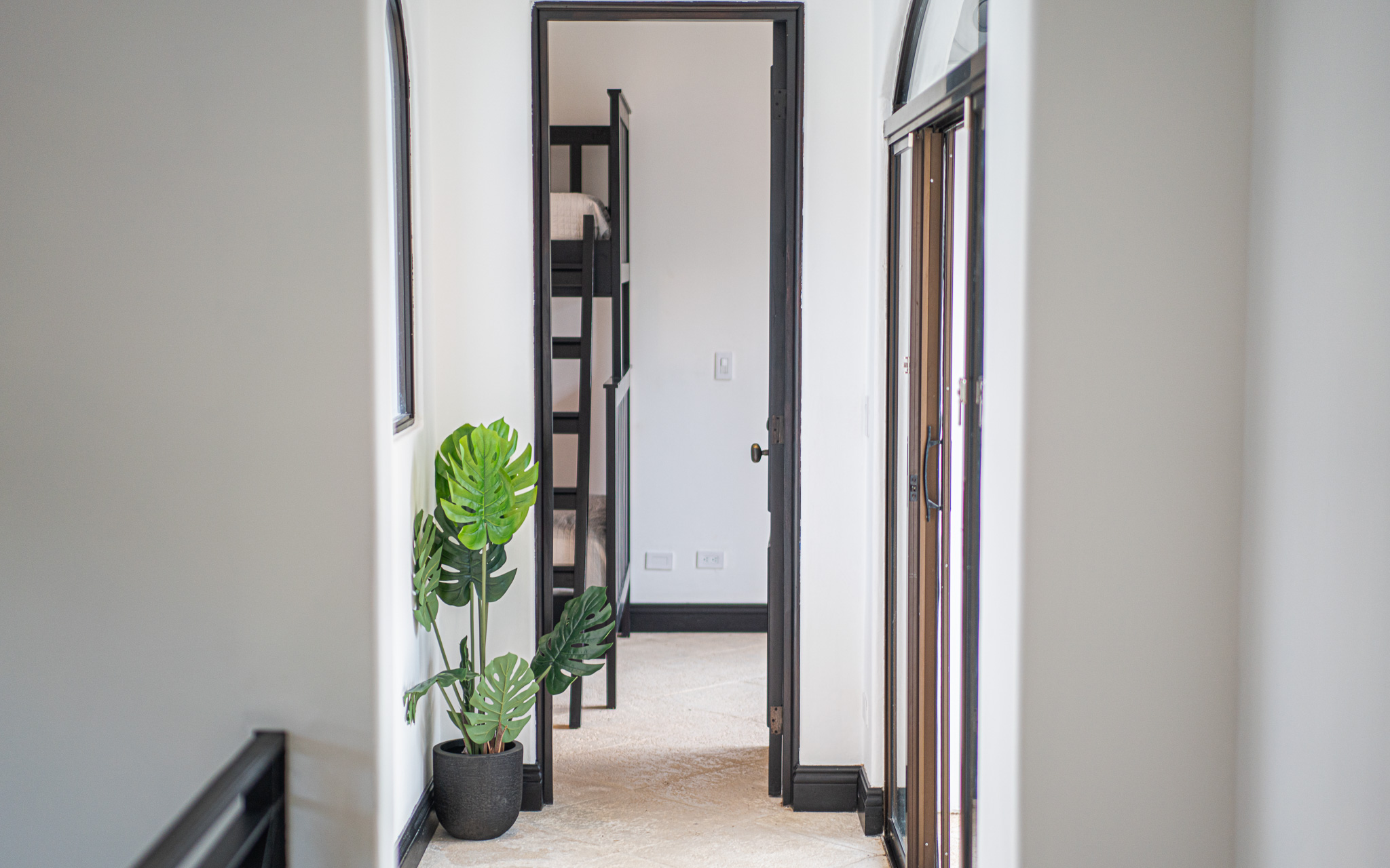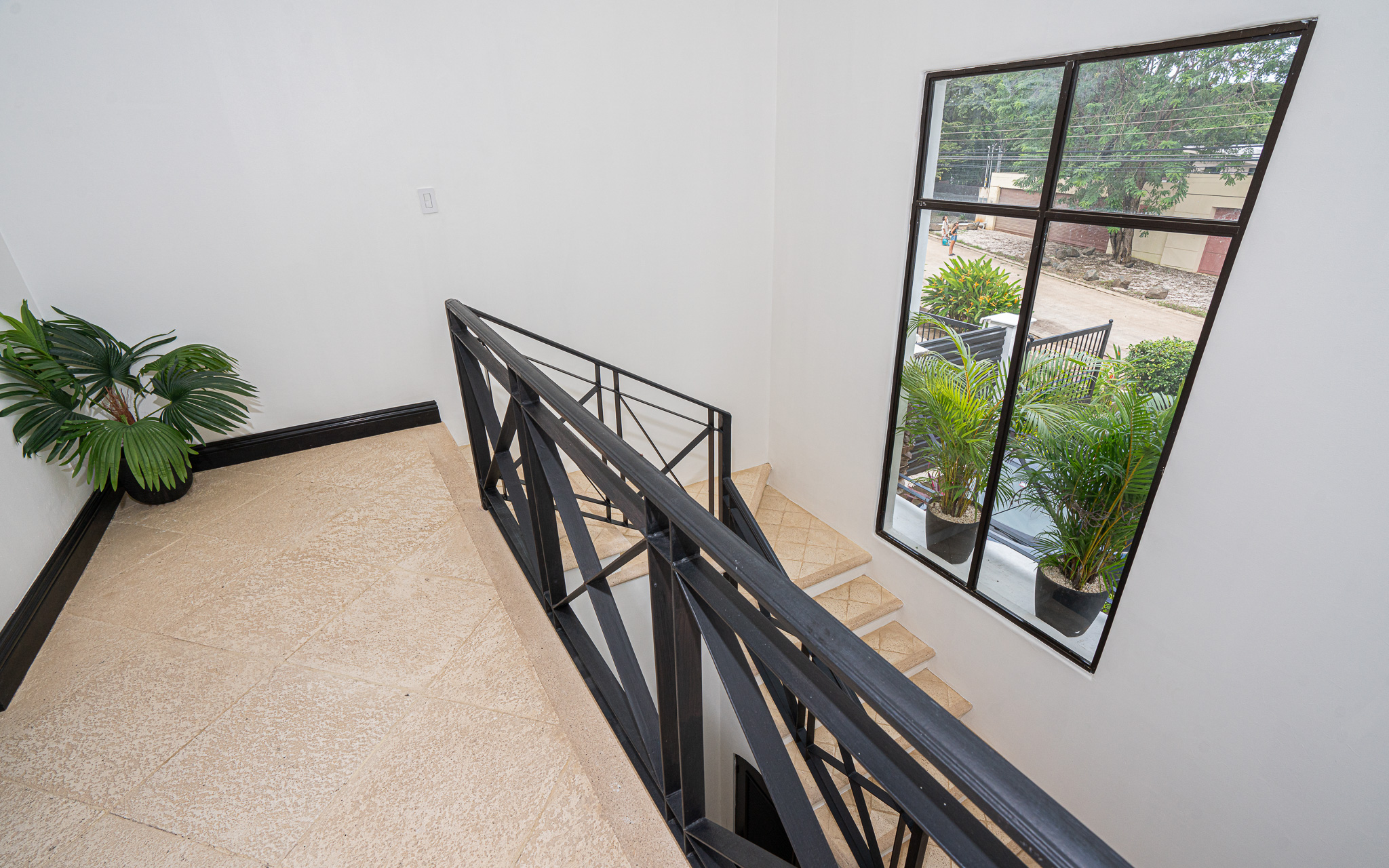On the second floor you will find another master bedroom with a king size bed, ensuite bathroom, closet, flat screen TV and a large outdoor terrace overlooking the pool. The patio is shared with the third bedroom. This bedroom has a large bunk bed that has a twin and a queen mattress that accommodates 3 adults. The 4th bedroom is separated from the main house and is located at the entrance to the property. It has a queen size bed, full en suite bathroom, office desk, AC, ceiling fan and is also equipped with an alarm system. This bedroom does not have a TV.