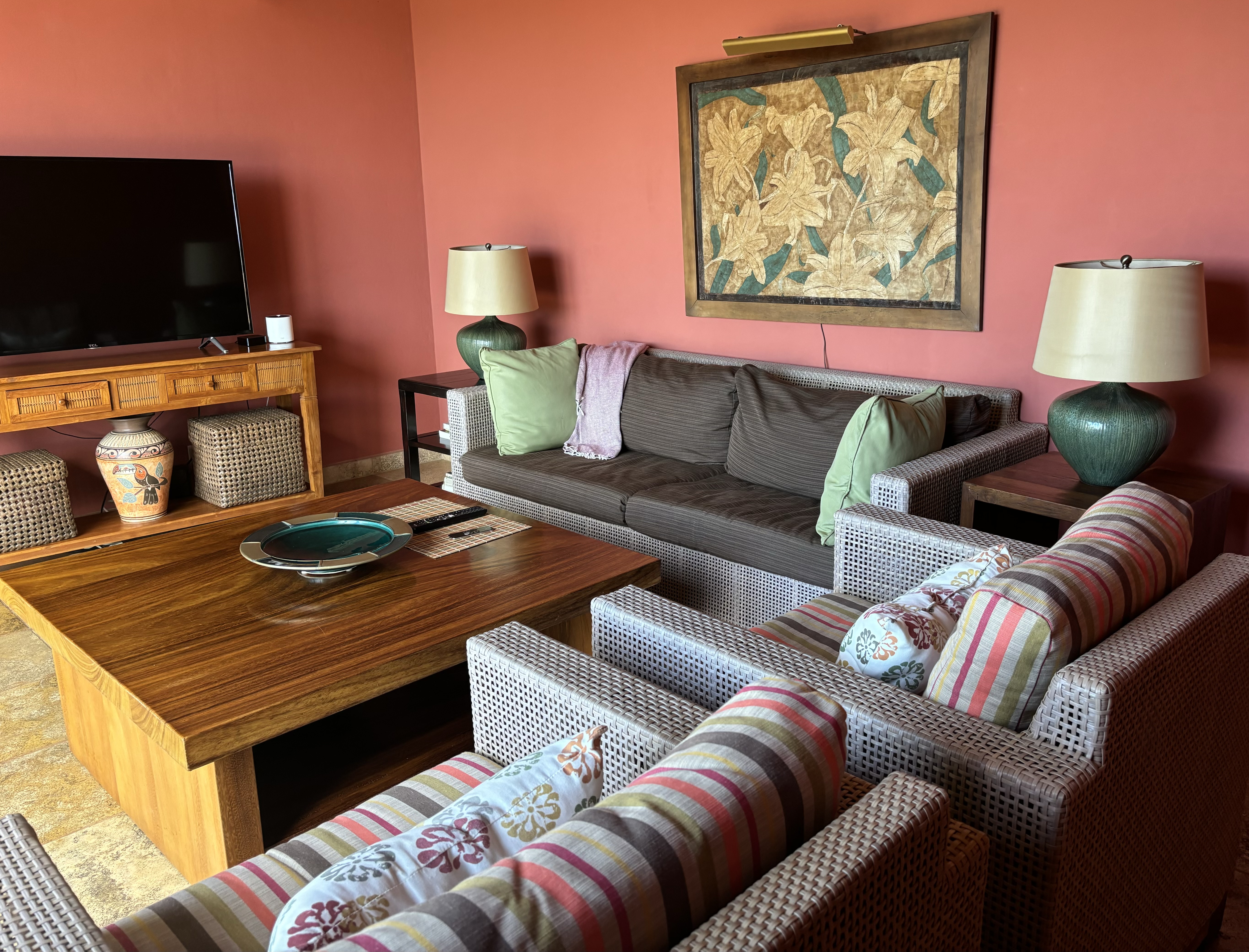 large living room with a 65” TV, two additional bedrooms overlooking the