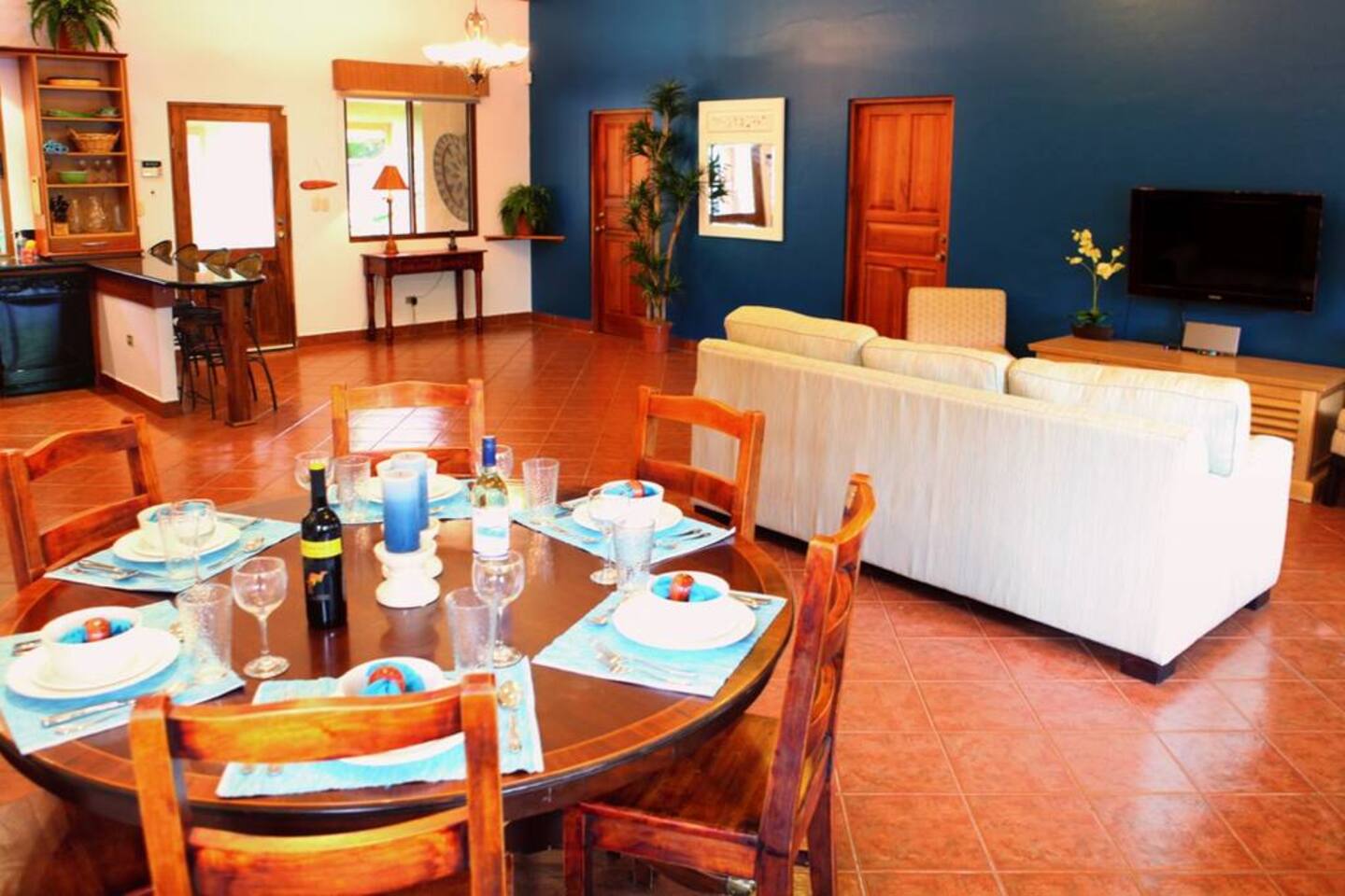The home was very clean and well equipped. The cleaning lady came mid week to tidy and the pool guy came once. Due to the season, perhaps pool cleaning could have been twice as there was much debris in the pool. We managed well enough and despite our aged swung on the Tarzan rope!! We brought in a chef who was able to create amazing meals in the well equipped kitchen. The only feedback would be to have some basics…salt, pepper, sugar, and hot sauce on hand as buying small portions not possible…enjoy the sugar packets!