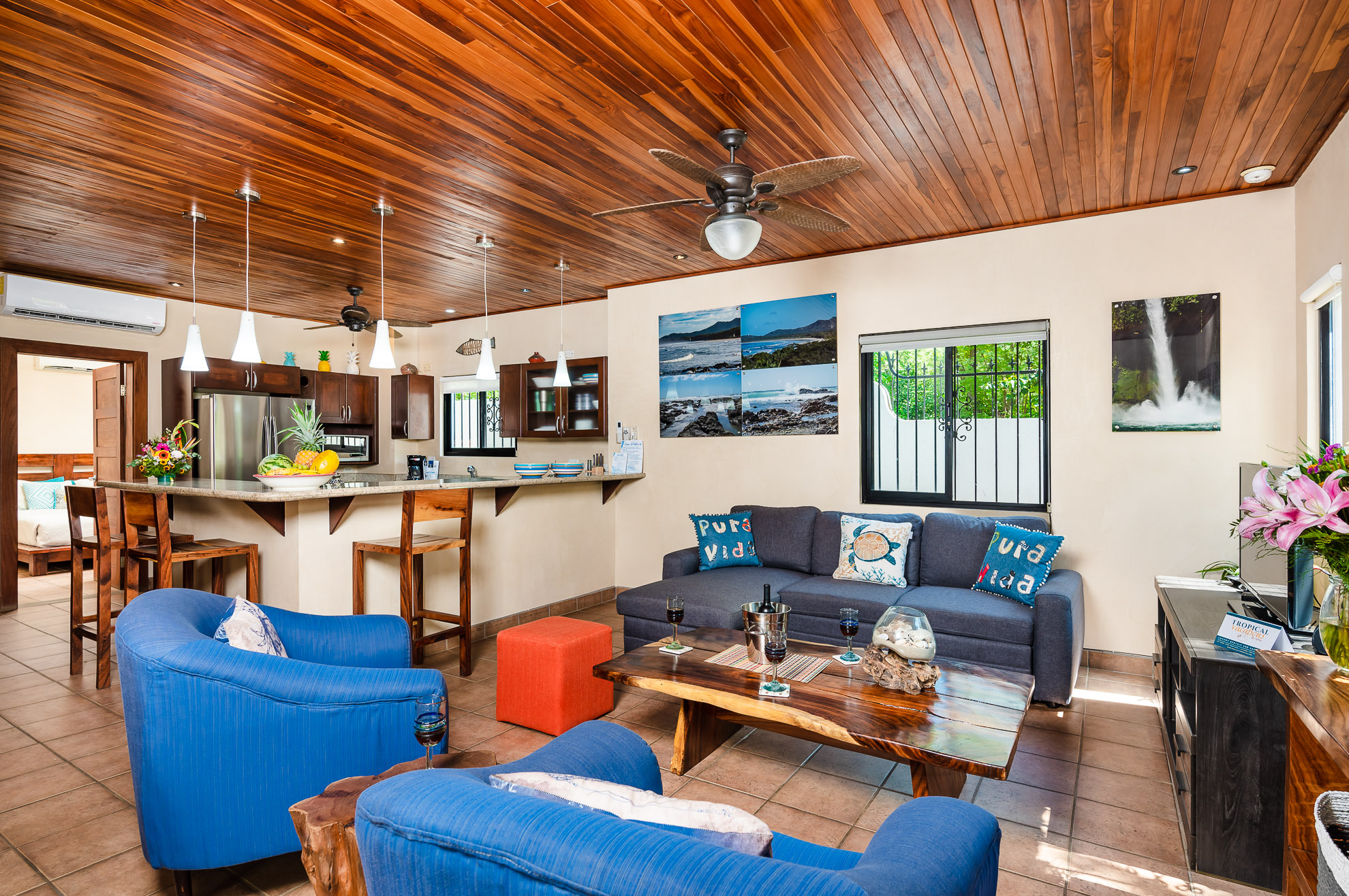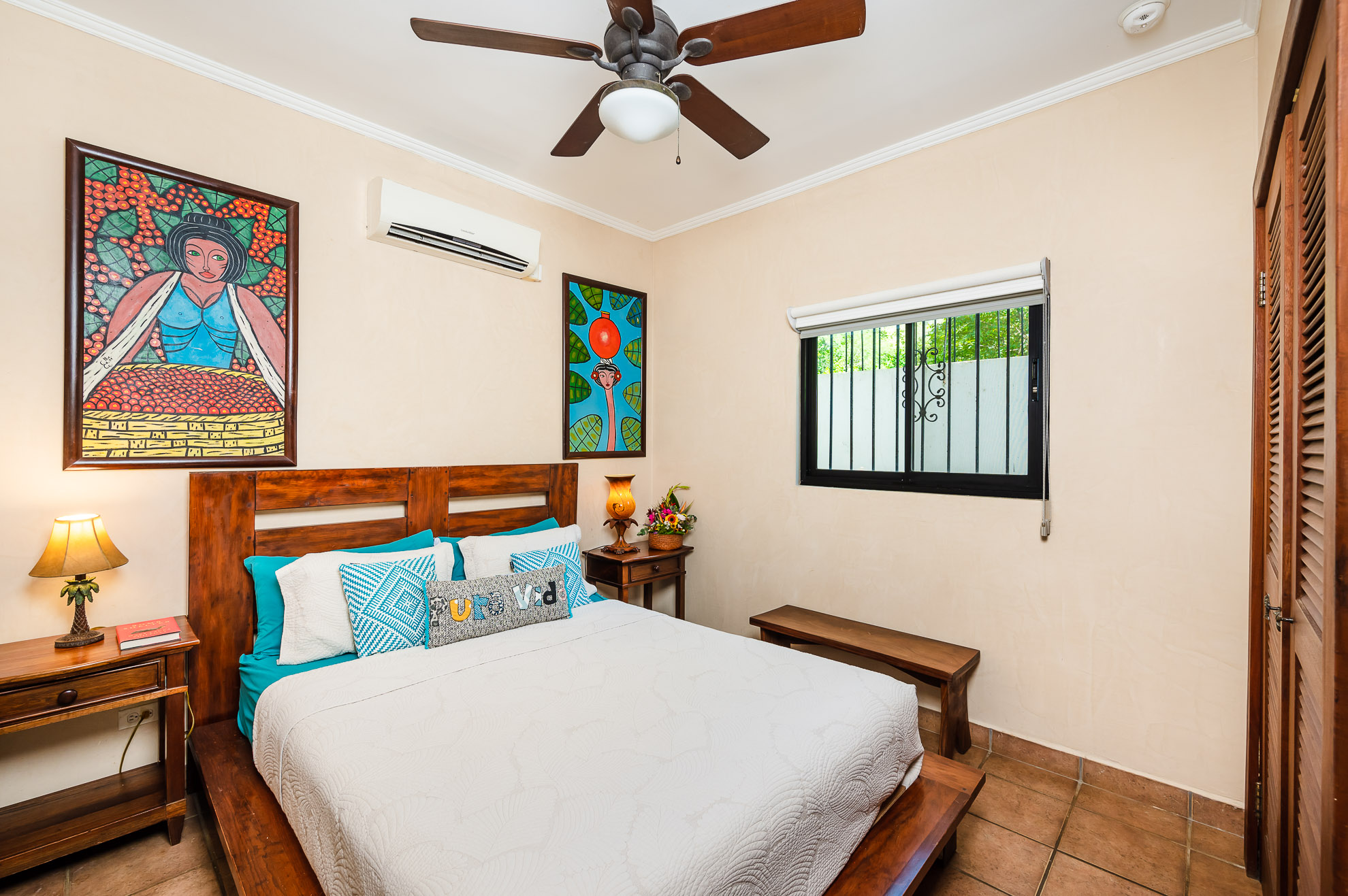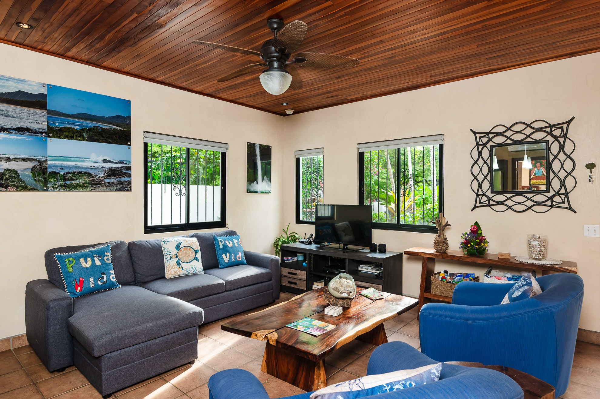 A Beautiful, 3BR condo with an eclectic mix of tropical & modern furniture & colorful Central American art. 2 full bedrooms & baths plus a den with a queen bed. Fully equipped kitchen, TV, A/C throughout, ceiling fans, private patio, and more.