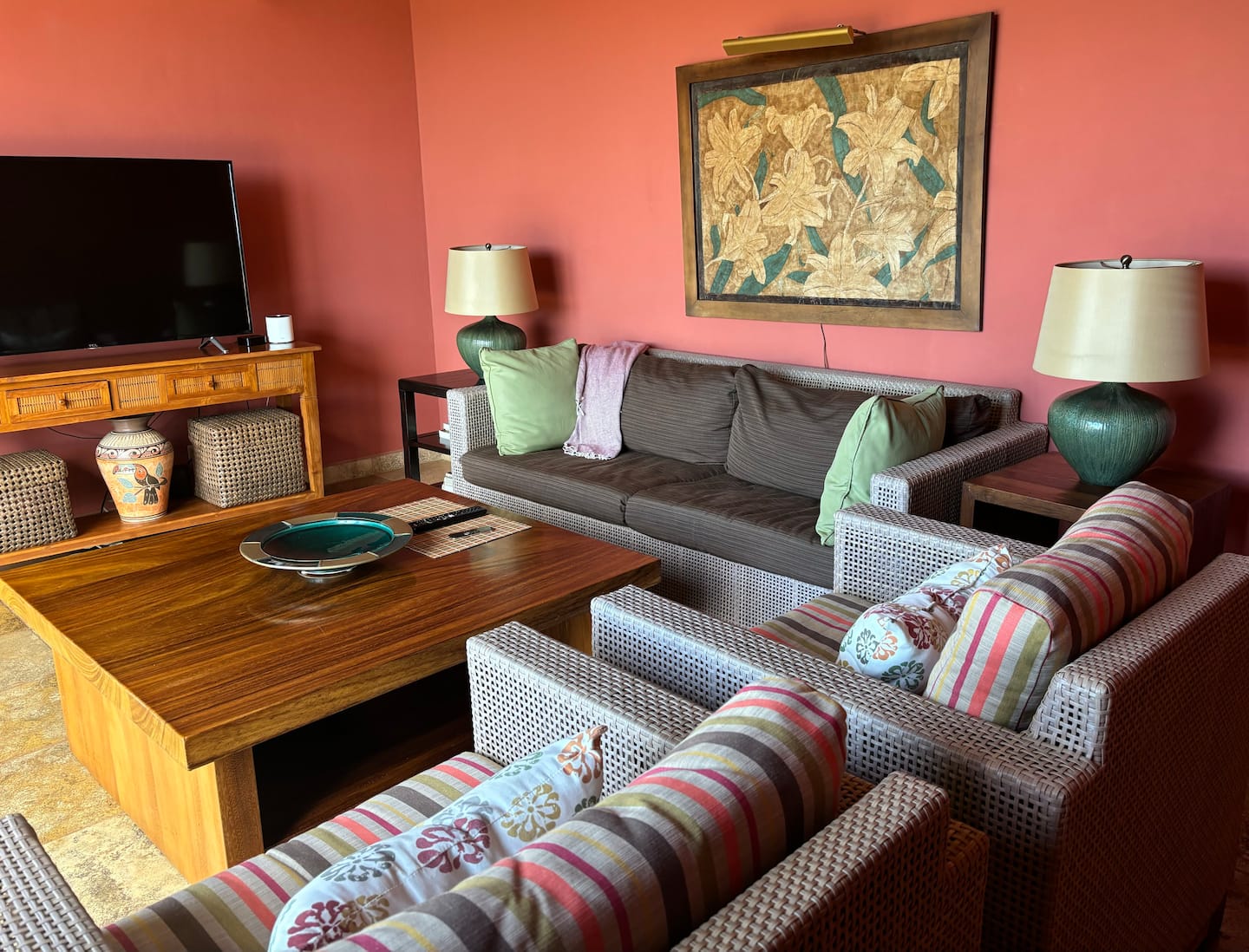 large living room with a 65” TV, two additional bedrooms overlooking the