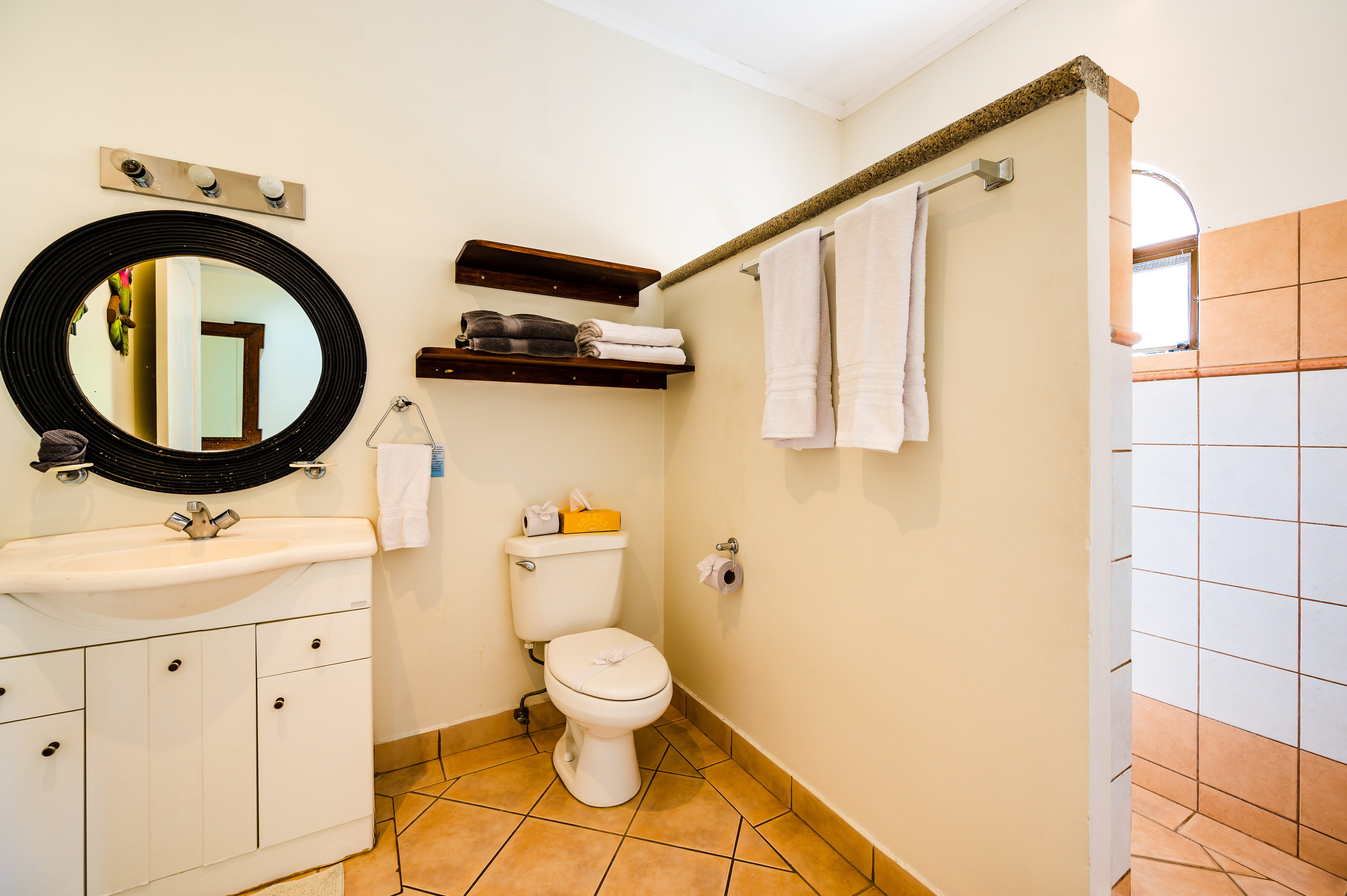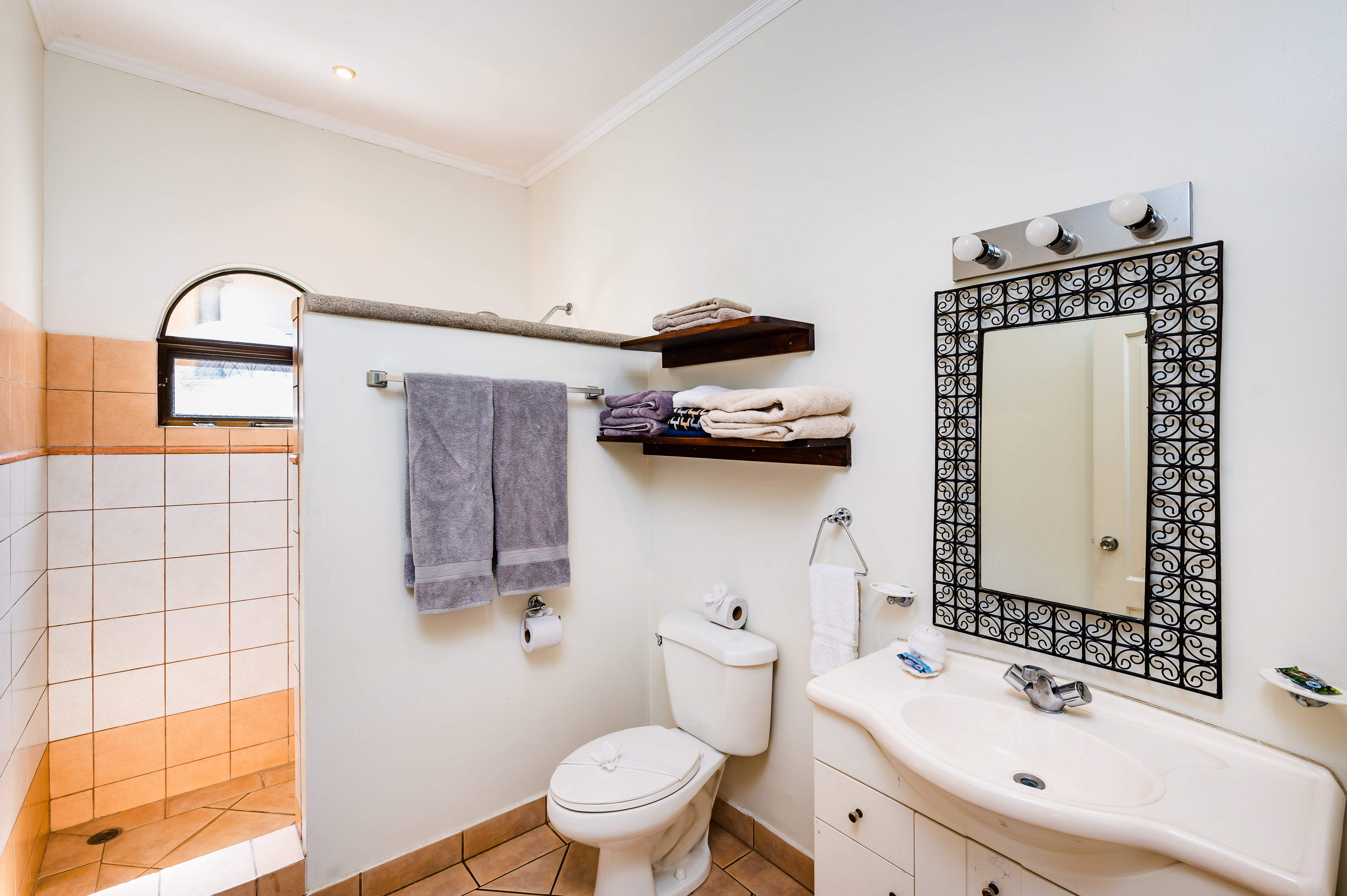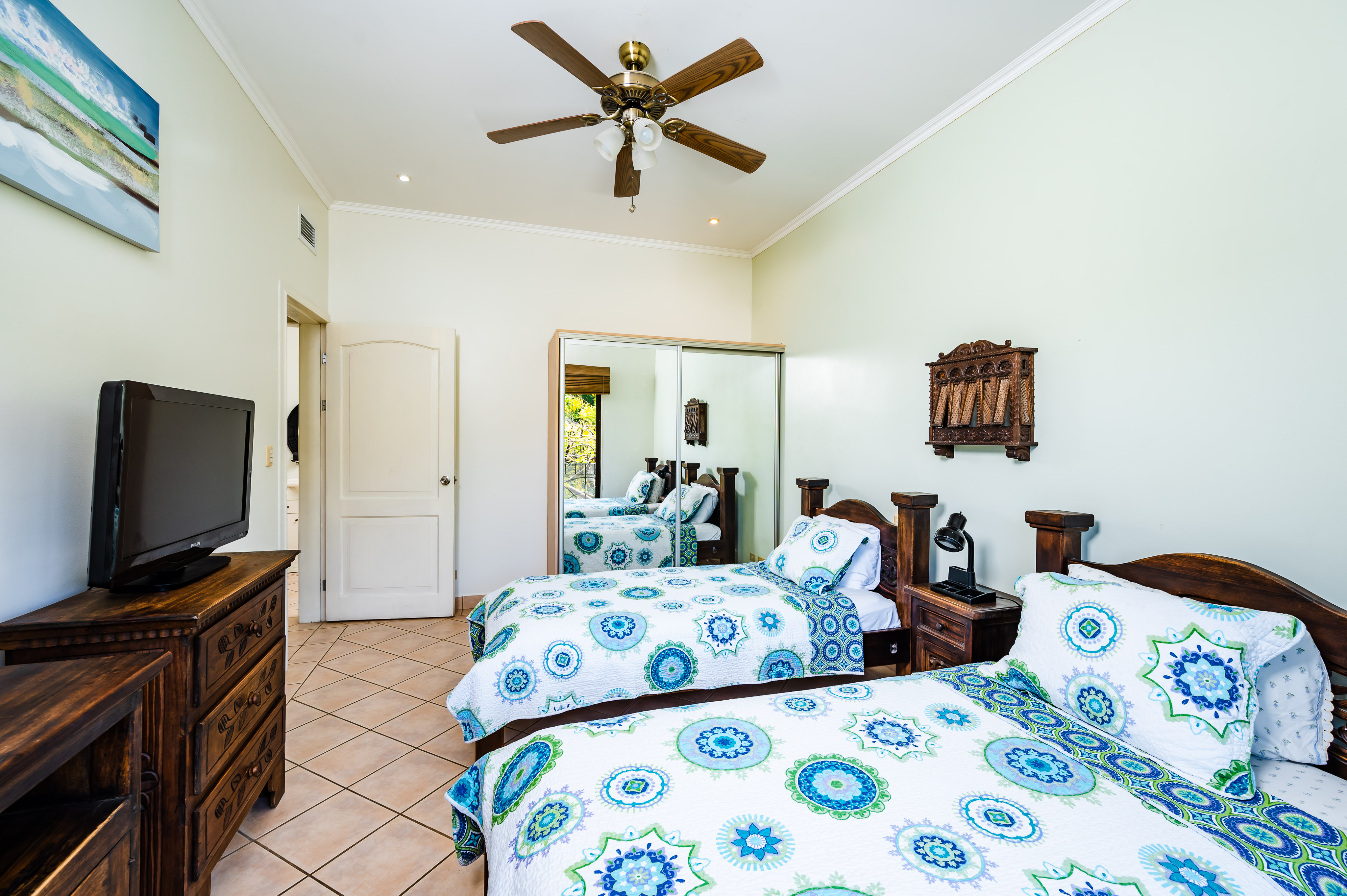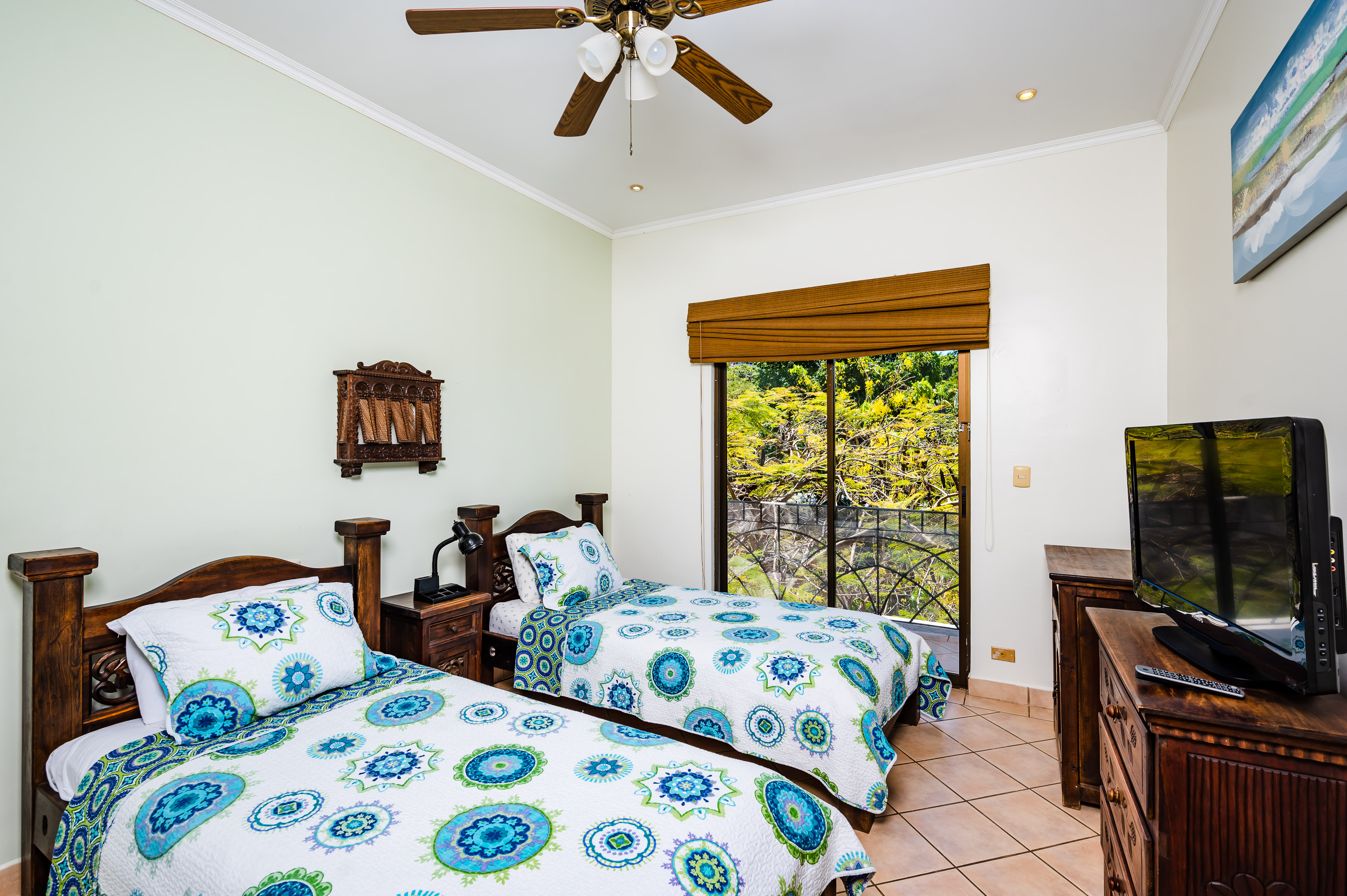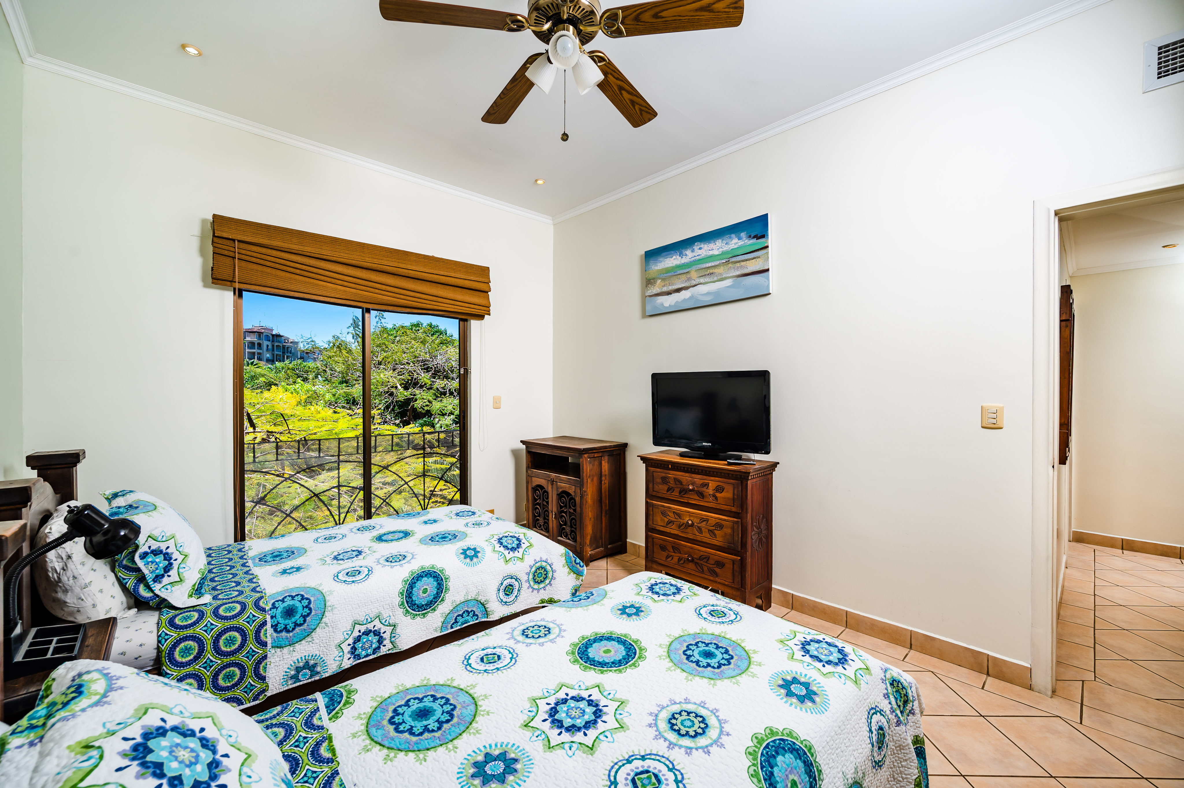 All three bedrooms are decorated nicely. Each bedroom has its own tv. The view from the master bedroom is the pool and beach beyond. The other two rooms have an adjoining balcony that has a view of the lush greenery. We even got to see families of monkeys swinging from the trees close by, as well as one individual monkey close up. The living room and kitchen are separated by a counter. The 2 bathrooms have sinks, walk in showers and toilets plus extra space. Lastly. The main balcony off of the living room has a big table for eating outside. We were lucky enough to be joined on our balcony by doves. There was a nest with one bird and another would come sit with the one in the nest. It was absolutely wonderful!!