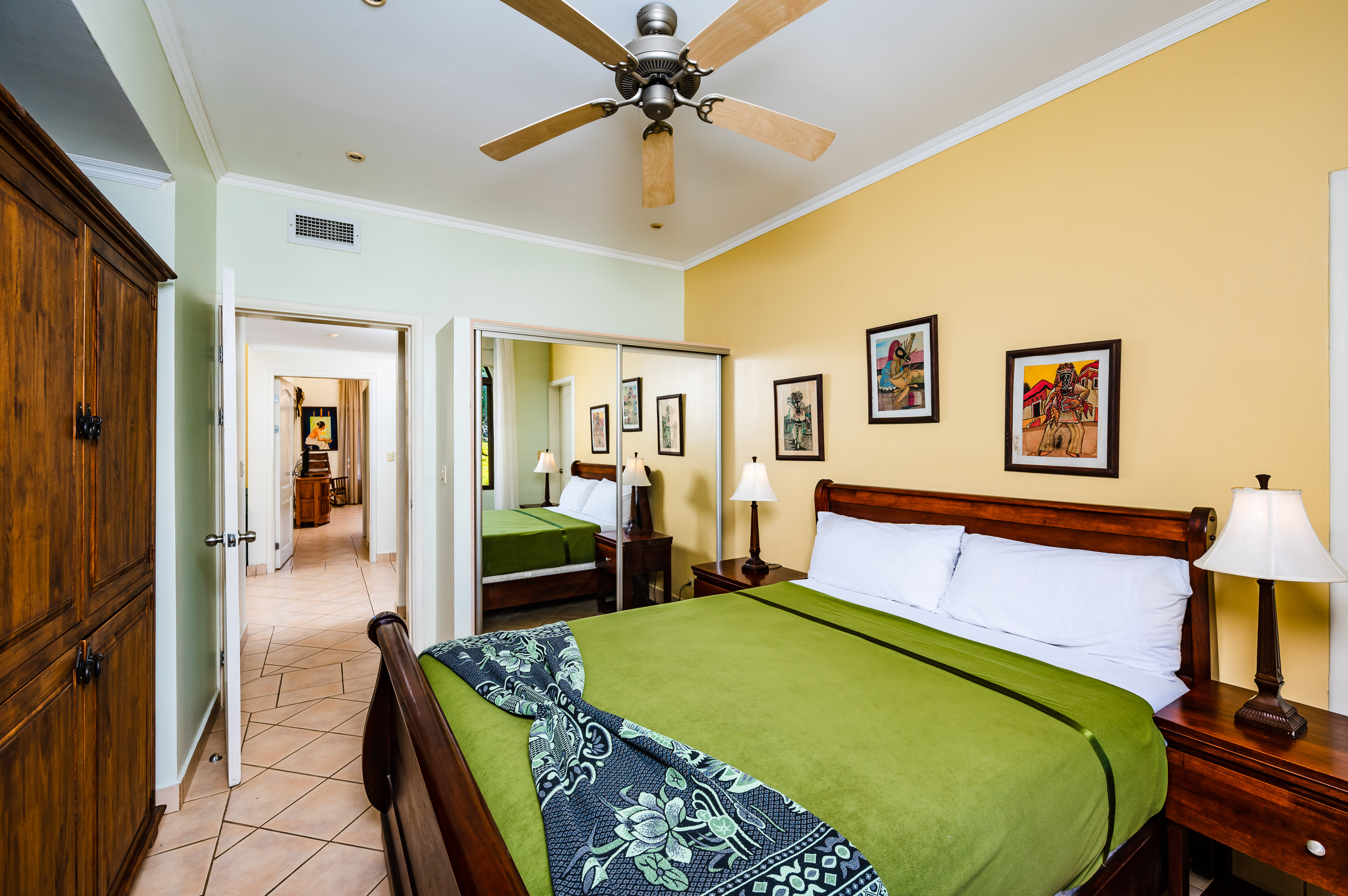 There are two other rooms in this condo. Room number one of the two features a queen sized bed, full sized closet and armoire and a door to the mini balcony shared inbetween this room and the third bedroom.