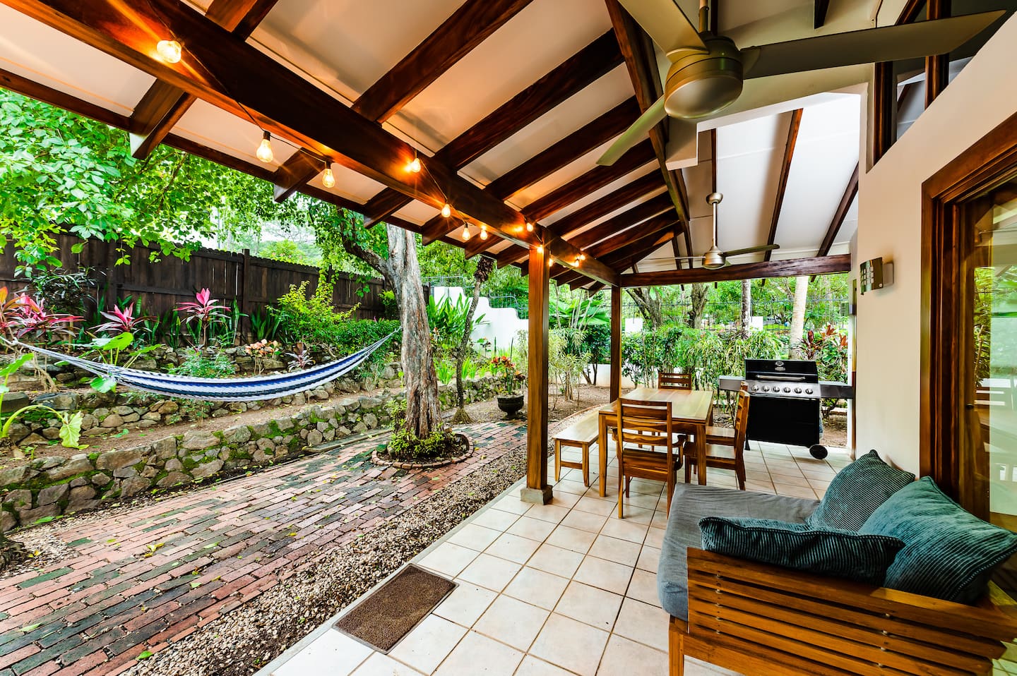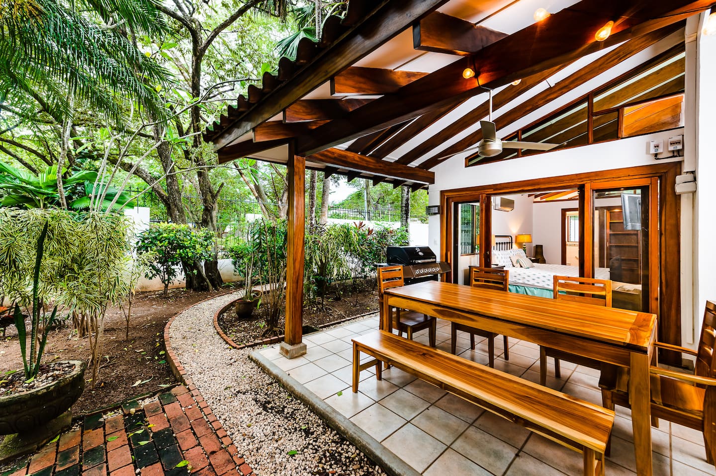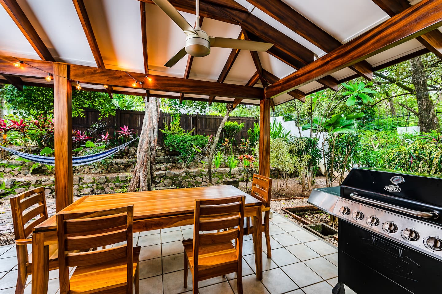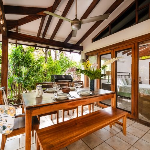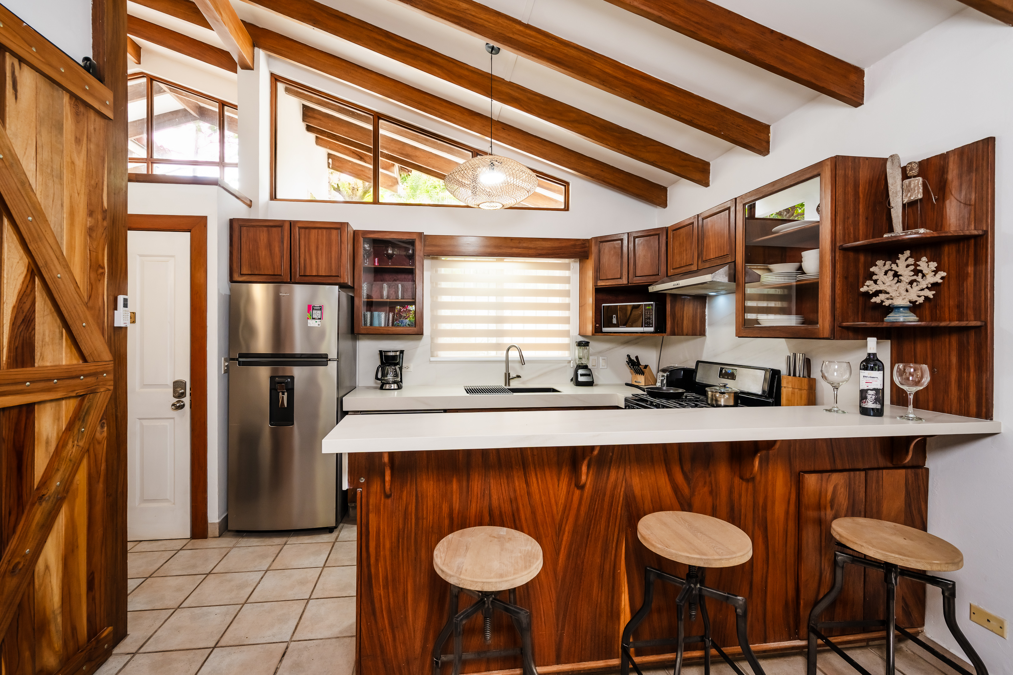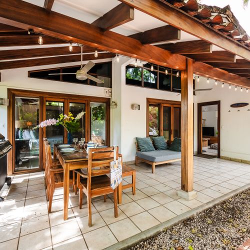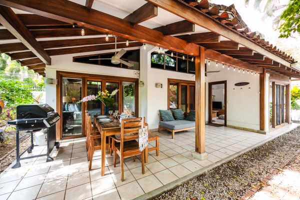 Casa Blanca is a small cluster of 5 villas just steps from the sandy, quiet end of Tamarindo beach. The gated property is covered by trees and an abundance of large tropical plants so that you can enjoy your own private oasis. All of Casa Blanca’s units have direct access to the large common pool and deck area. A unique stone bridge that arches over a corner of the pool connects the pool deck area with Casa Blanca #1’s shady, private garden and parking spot.