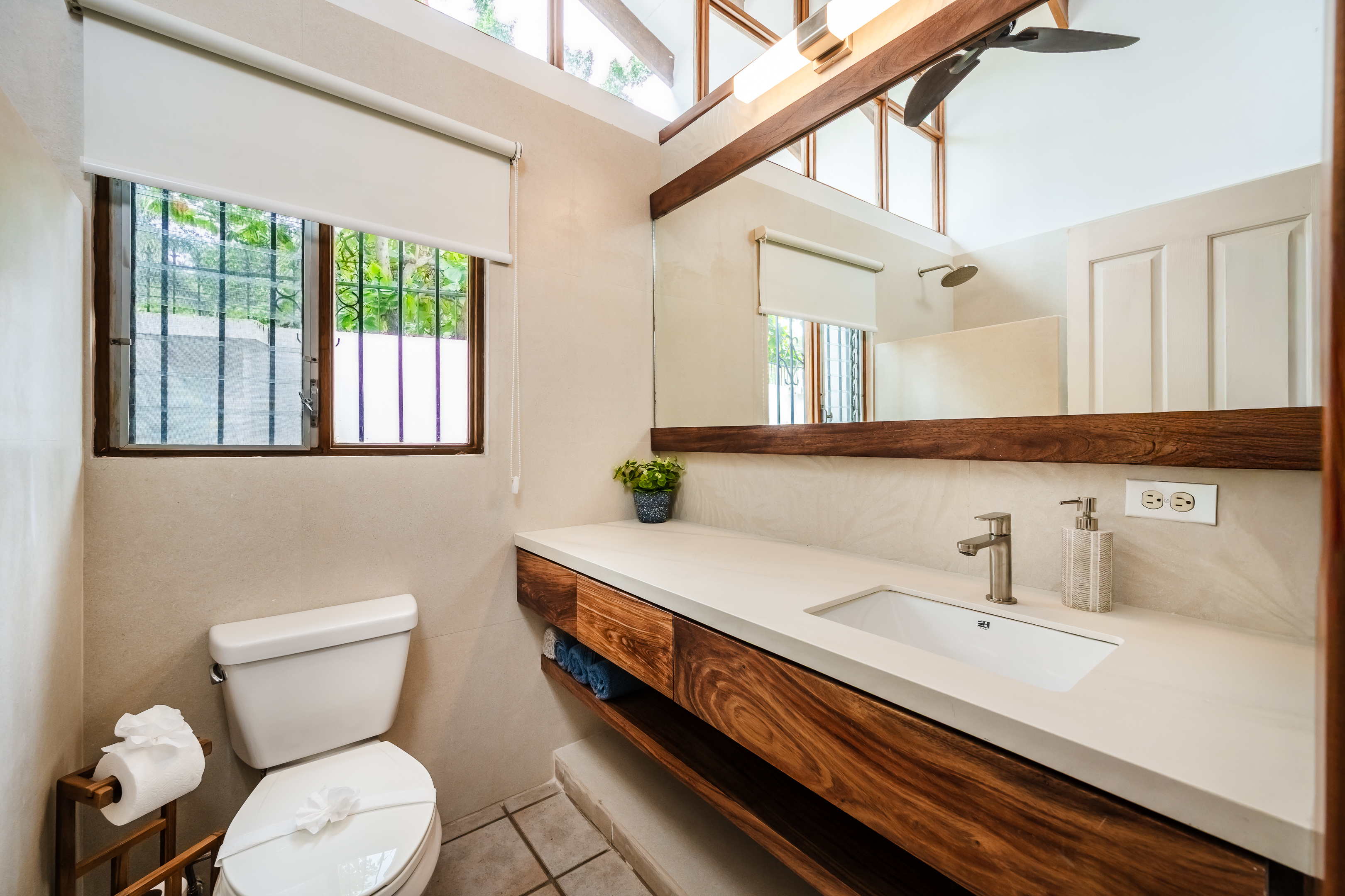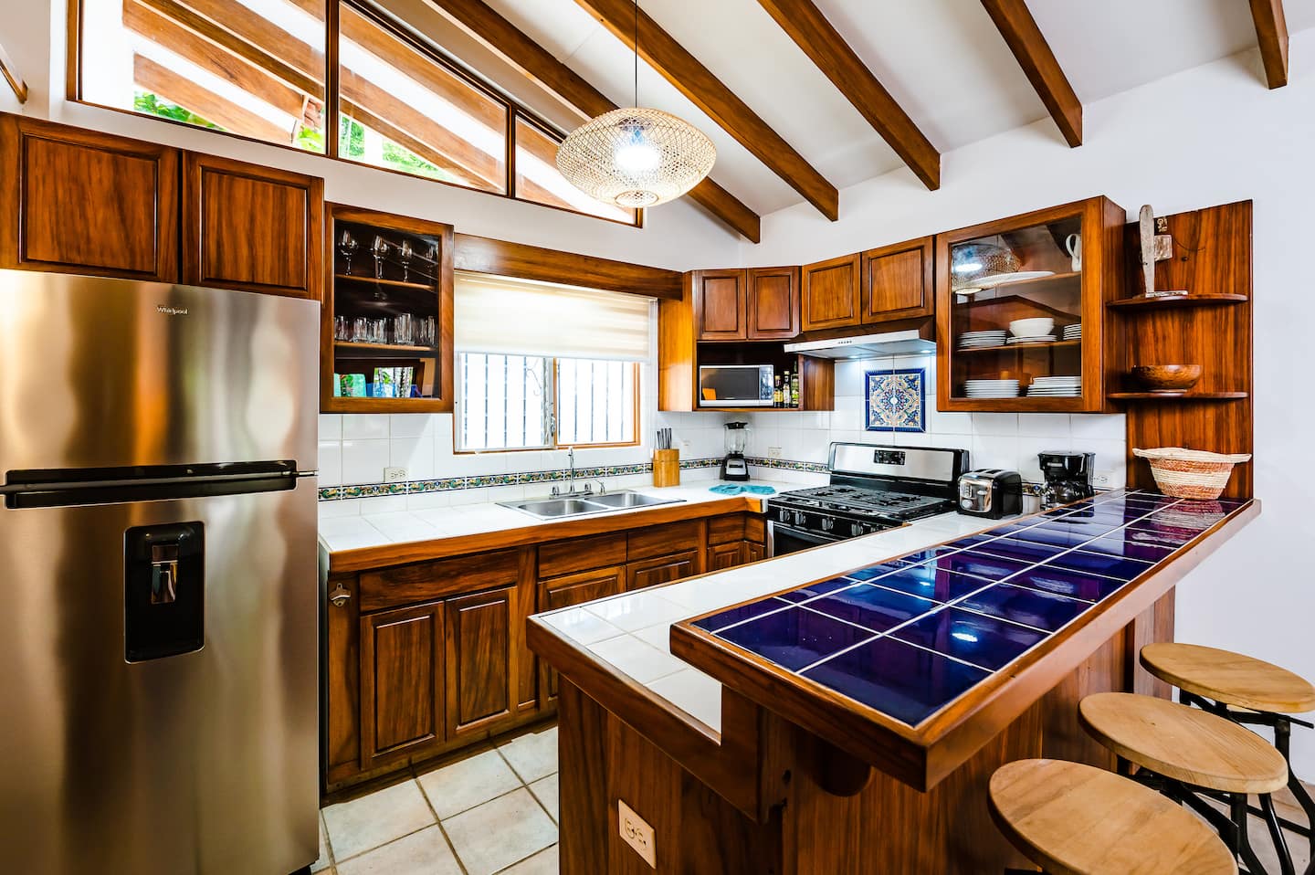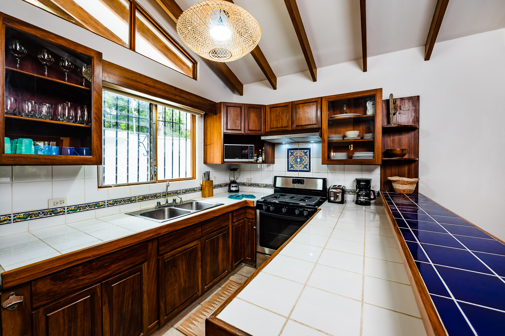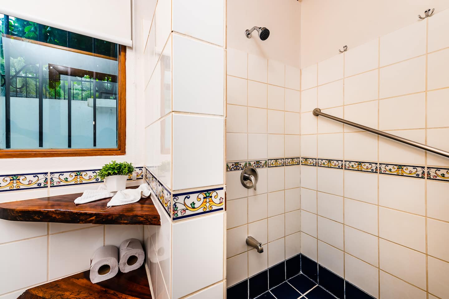 Casa Blanca is a small cluster of 5 villas just steps from the sandy, quiet end of Tamarindo beach. The gated property is covered by trees and an abundance of large tropical plants so that you can enjoy your own private oasis. All of Casa Blanca’s units have direct access to the large common pool and deck area. A unique stone bridge that arches over a corner of the pool connects the pool deck area with Casa Blanca #1’s shady, private garden and parking spot.