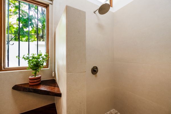 It is a charming villa with three bedrooms and two bathrooms thoughtfully distributed across two floors. On the first floor, you'll find the master bedroom to the left of the entrance, featuring a comfortable king-size bed located next to the shared bathroom. Toward the back of the villa is the first guest bedroom with a queen-size bed. Upstairs, the third bedroom is a private suite with two single beds and its own bathroom, offering added privacy and comfort.