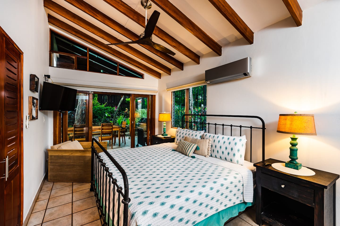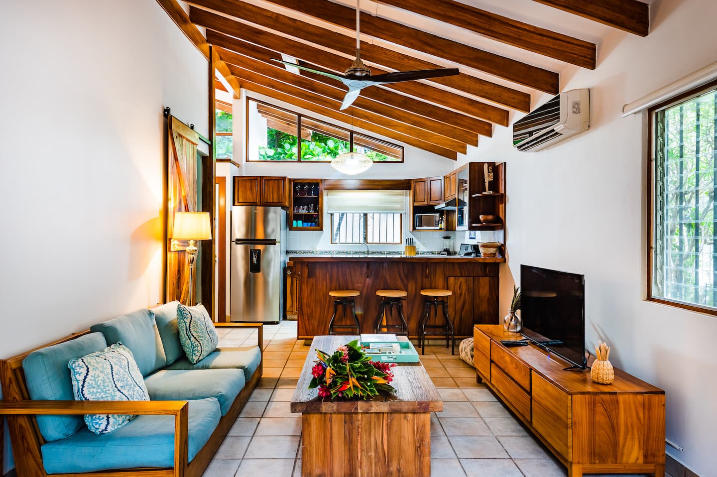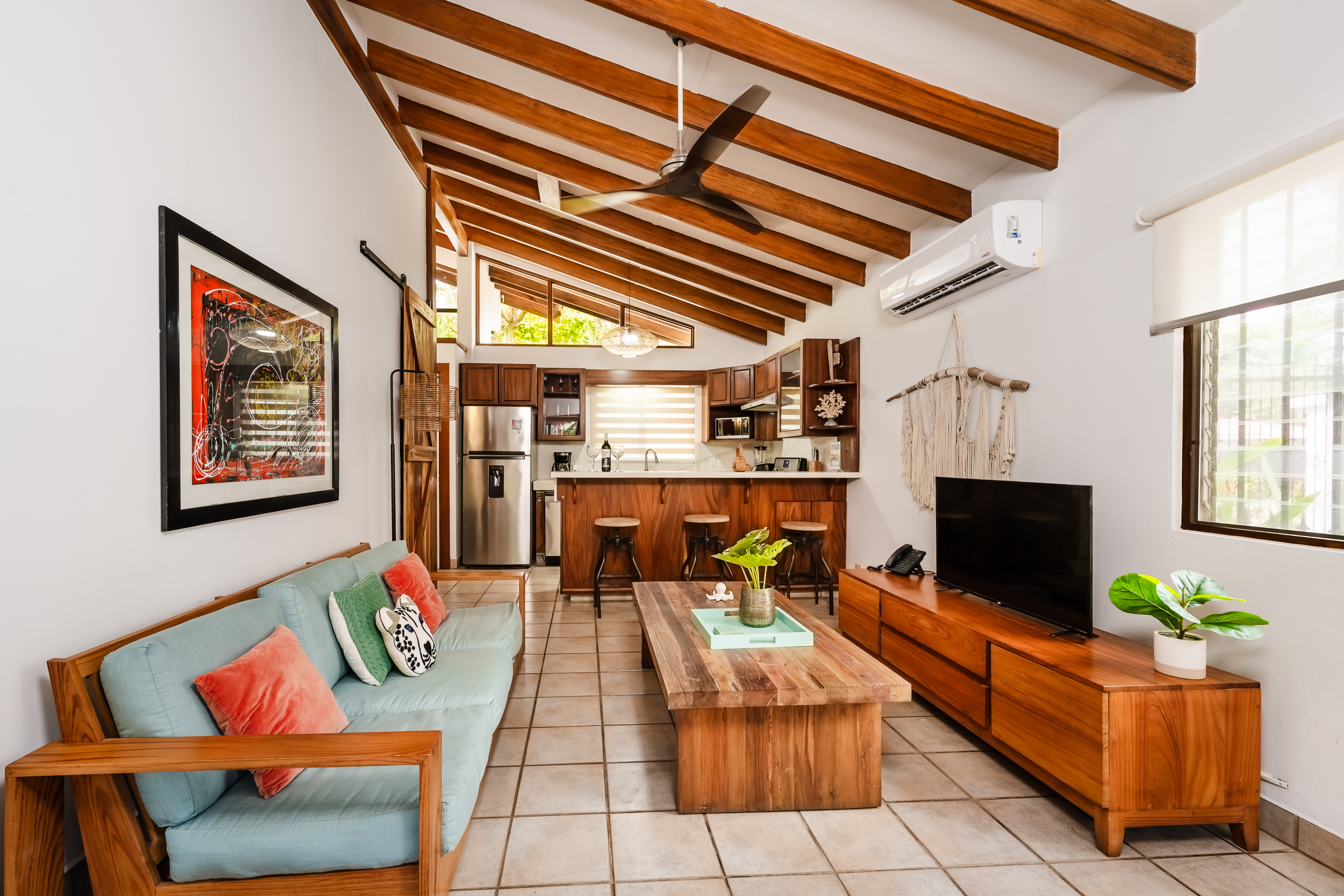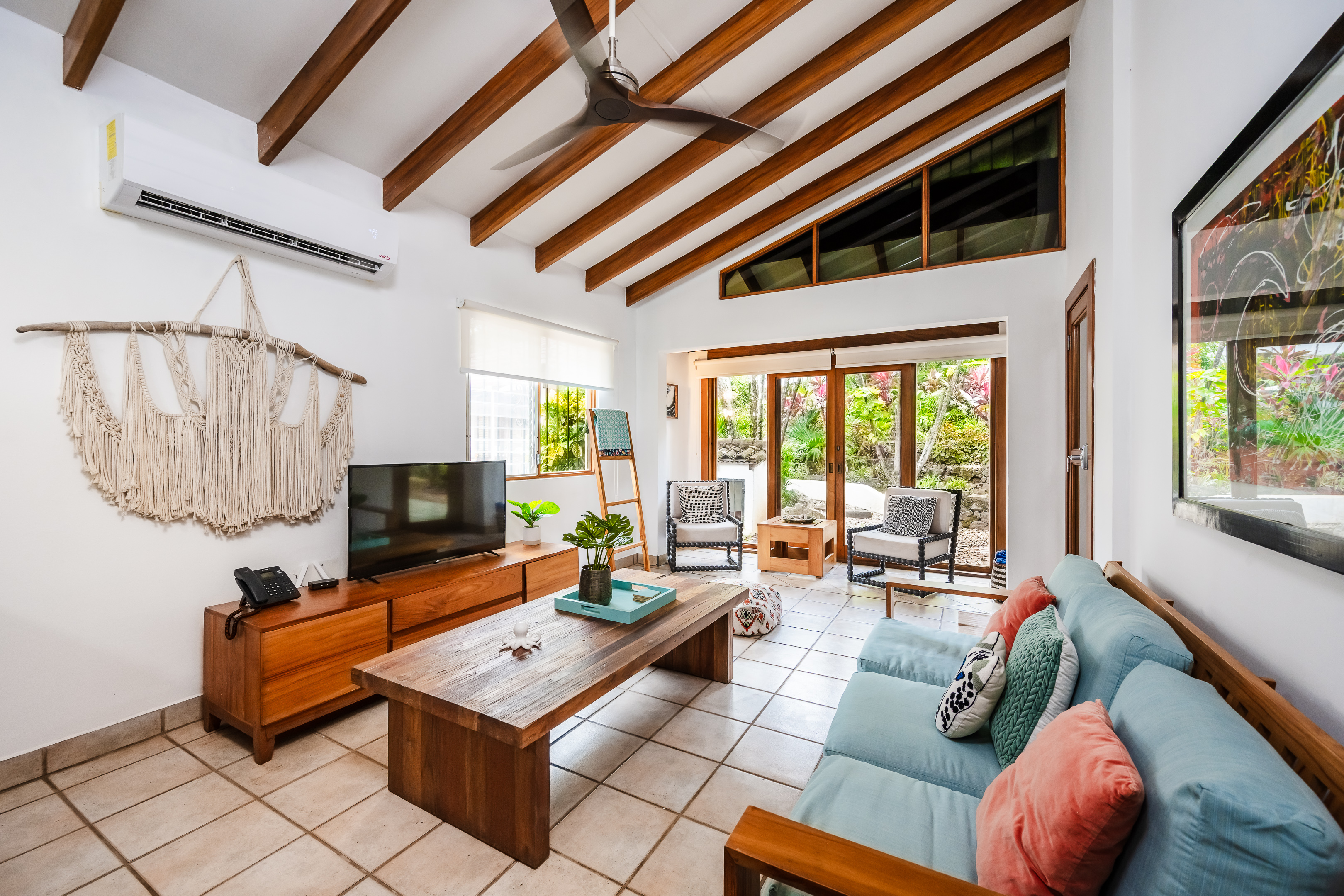 Inside the double glass doors, the open and airy living room offers a comfortable place to relax. While each room has air conditioning, the many screened windows and ceiling fans allow for tons of natural light and air to circulate throughout the villa so that you can enjoy a natural breeze if you choose not to depend on air conditioning. From the wooden beams to the eclectic collection of artwork on the walls, this beach bungalow will make you feel at home.