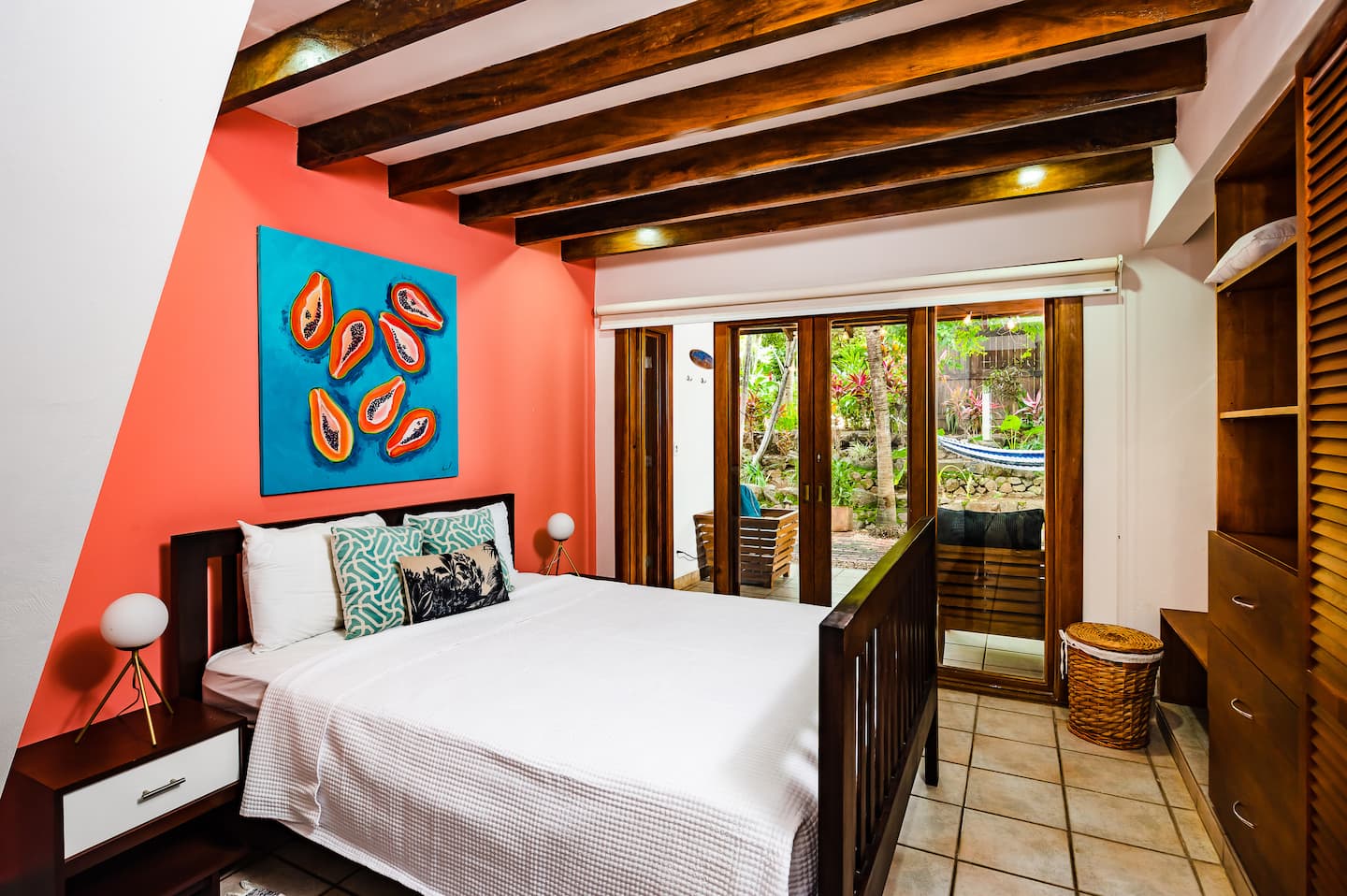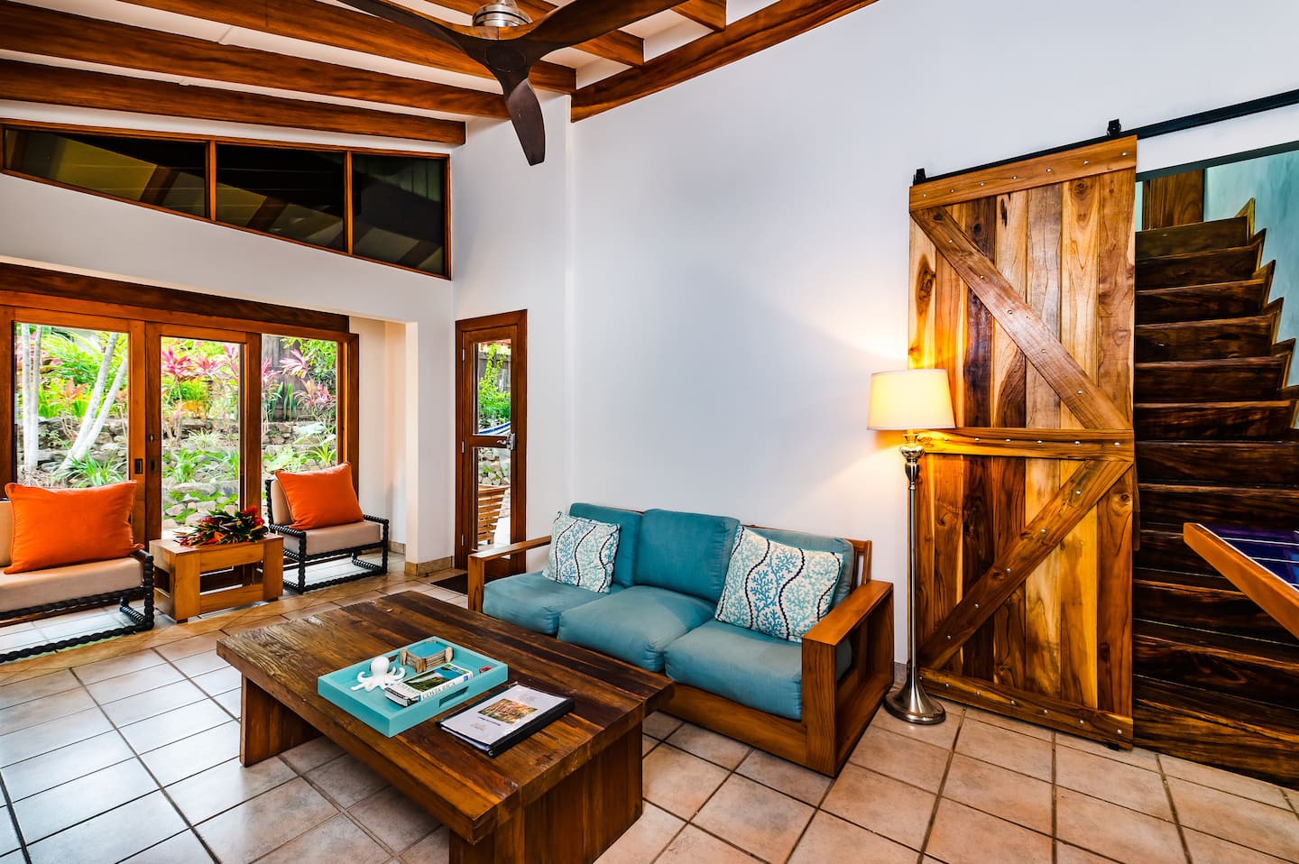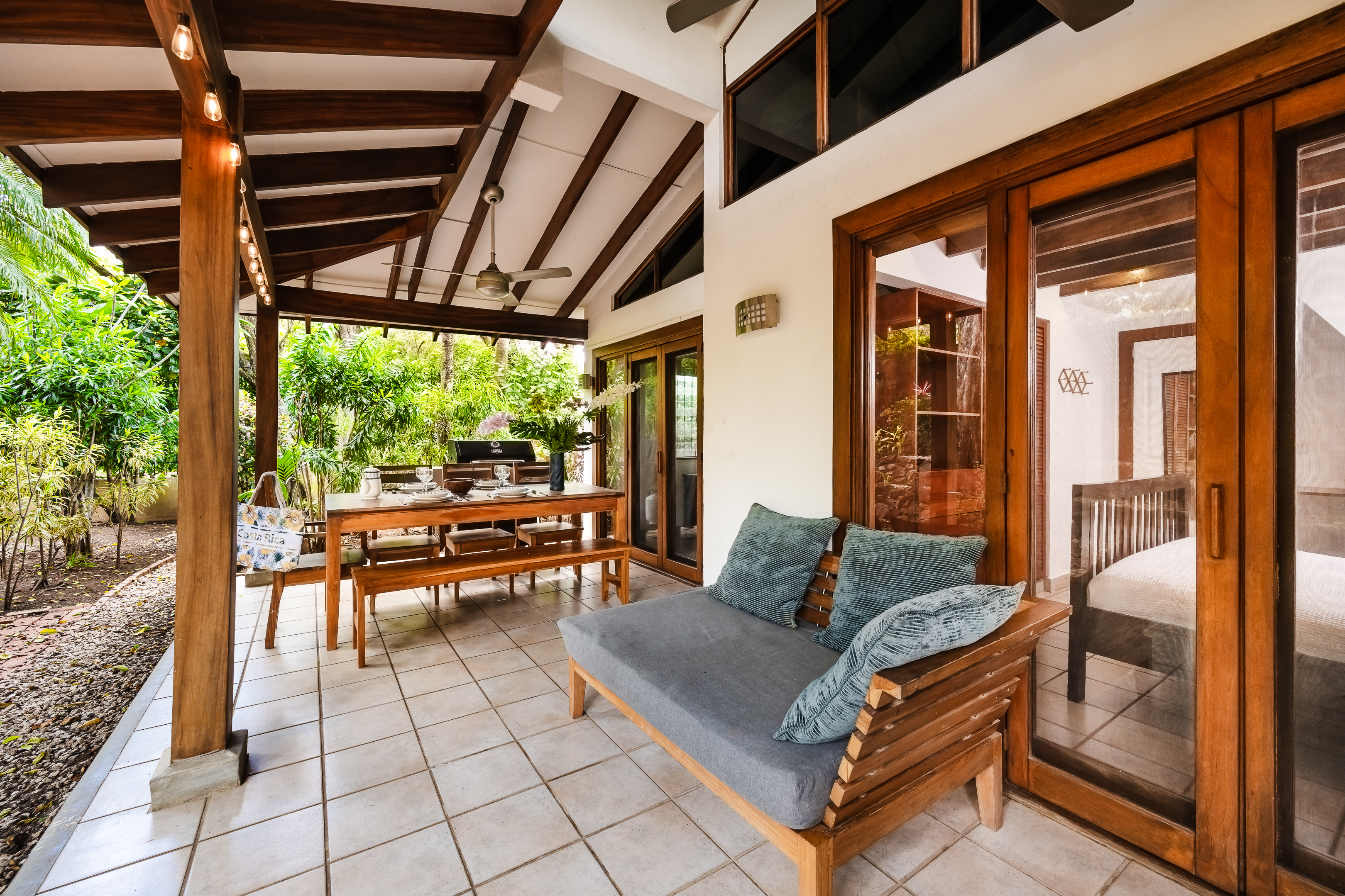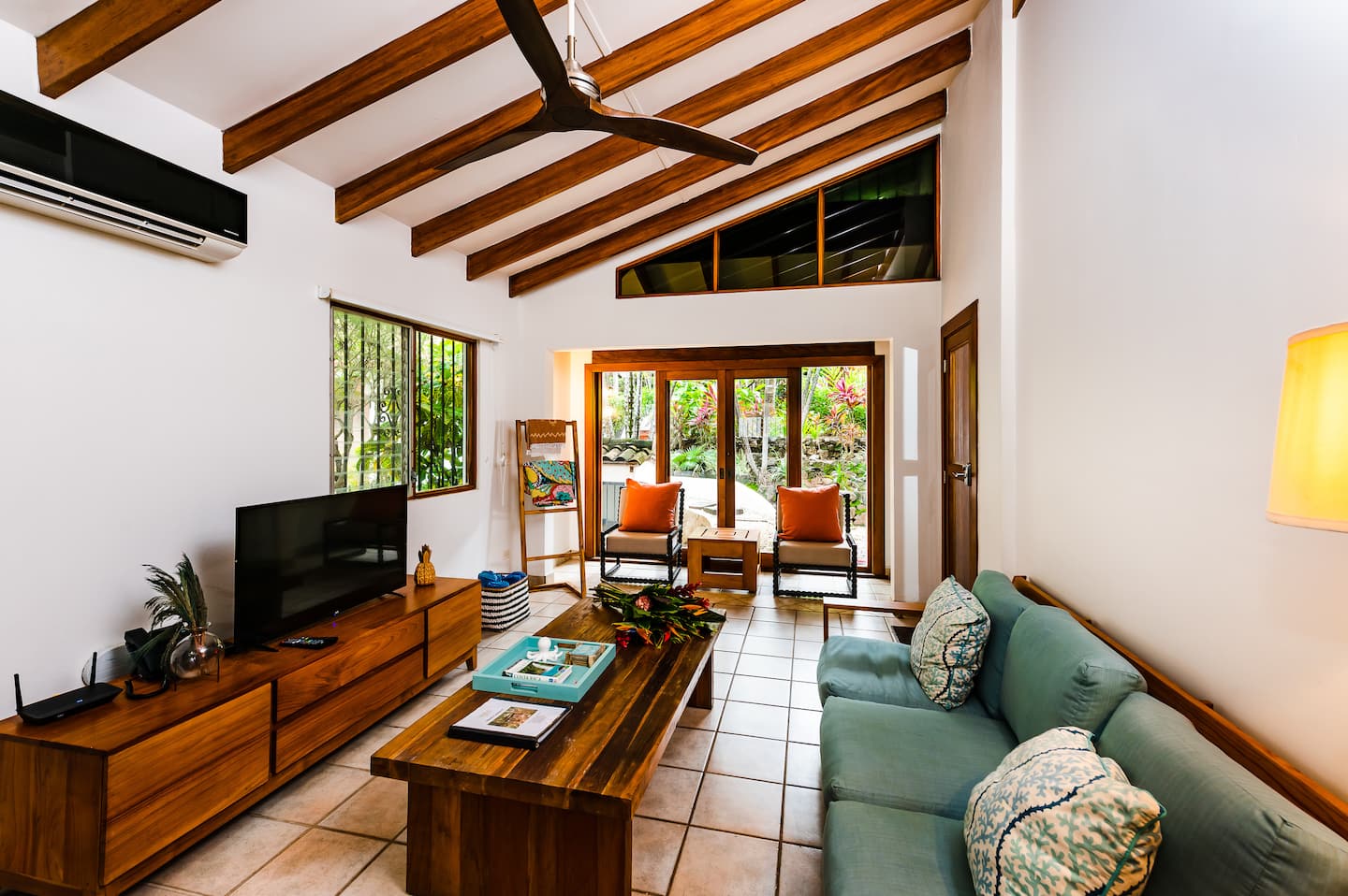 Inside the double glass doors, the open and airy living room offers a comfortable place to relax. While each room has air conditioning, the many screened windows and ceiling fans allow for tons of natural light and air to circulate throughout the villa so that you can enjoy a natural breeze if you choose not to depend on air conditioning. From the wooden beams to the eclectic collection of artwork on the walls, this beach bungalow will make you feel at home.