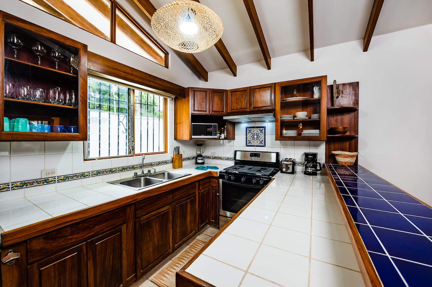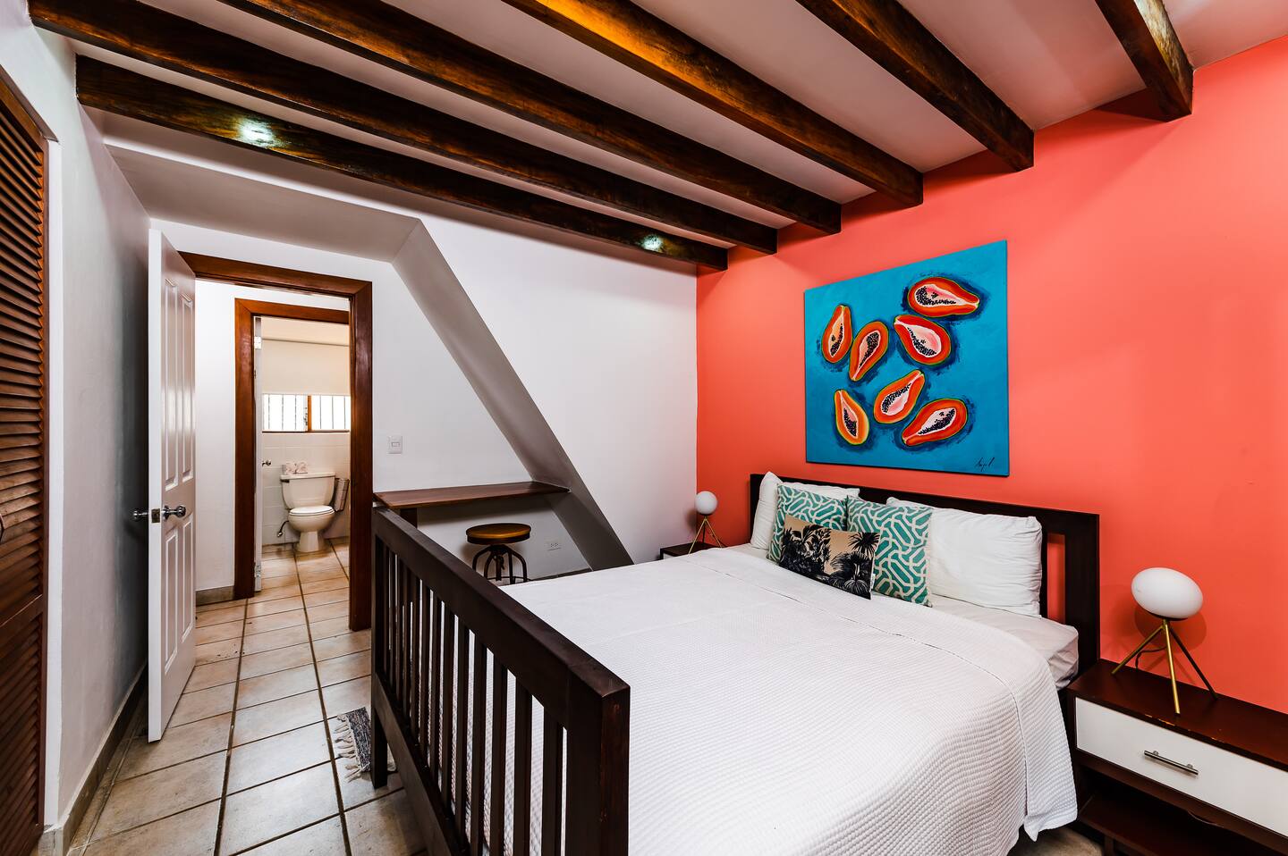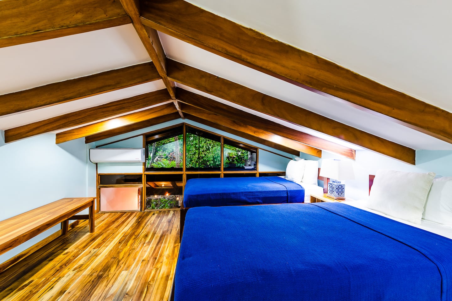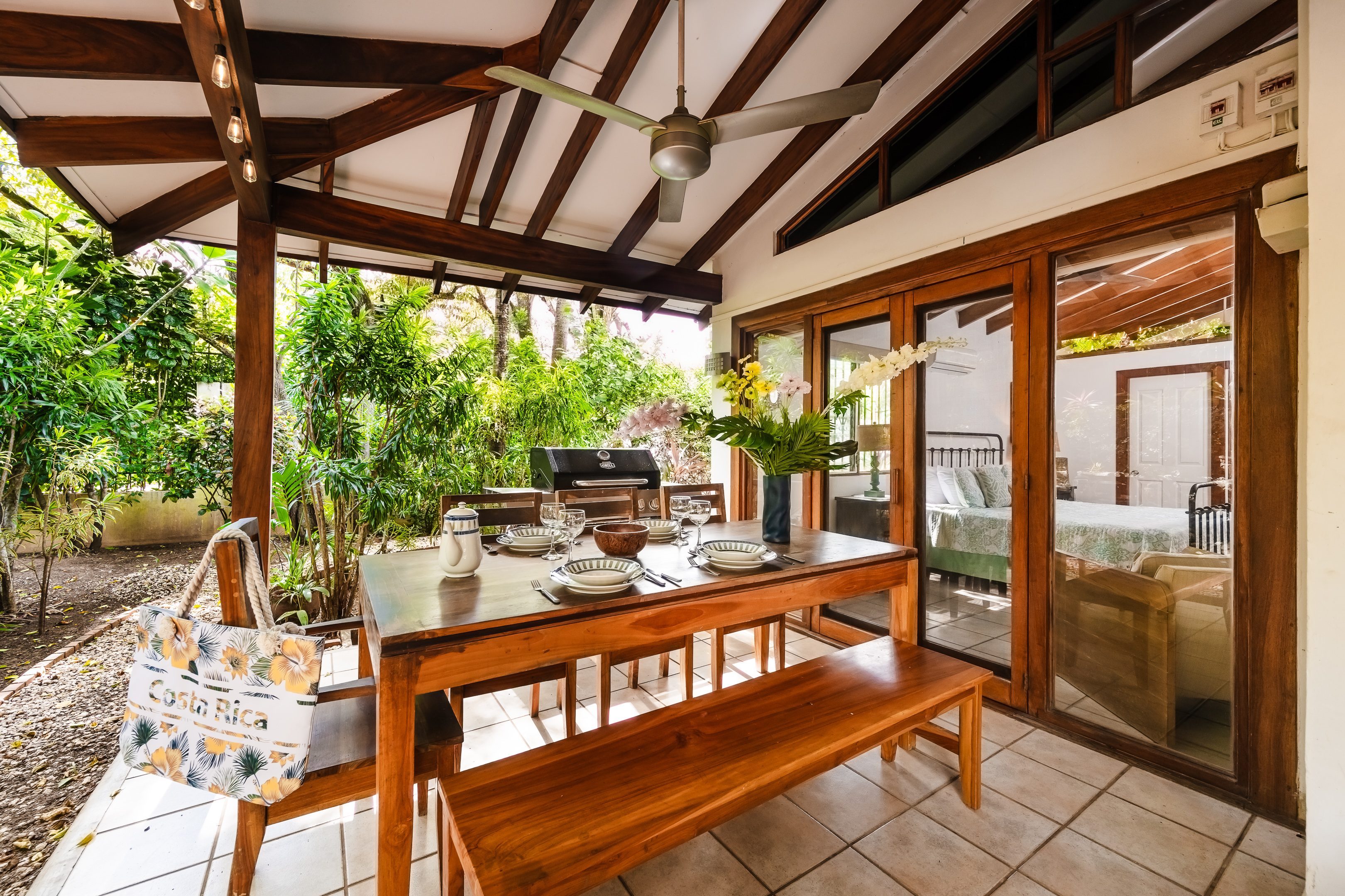 Inside the double glass doors, the open and airy living room offers a comfortable place to relax. While each room has air conditioning, the many screened windows and ceiling fans allow for tons of natural light and air to circulate throughout the villa so that you can enjoy a natural breeze if you choose not to depend on air conditioning. From the wooden beams to the eclectic collection of artwork on the walls, this beach bungalow will make you feel at home.