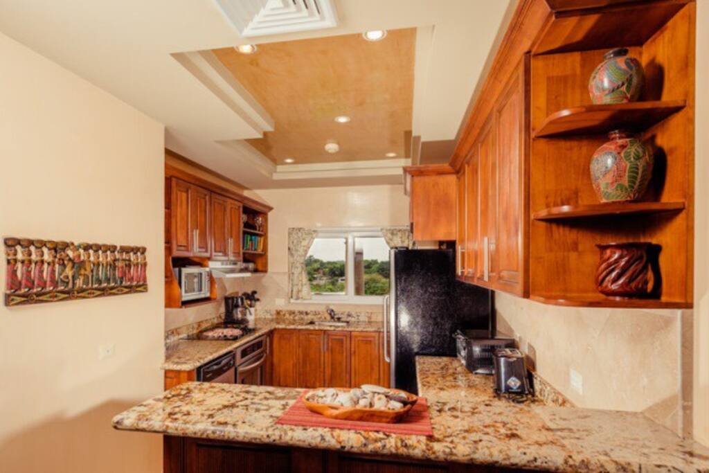 On the lower 2BR level there is a fully equipped state-of-the-art kitchen with beautiful granite counter tops that adjoins the living area. Efficiently compact and practical, the kitchen includes a flattop electric stove, oven, large double-door refrigerator with an ice dispenser, a dishwasher and all the necessary items to create and enjoy your favorite meals. A small and comfortable washroom is located between the kitchen and the main door.