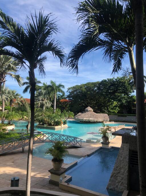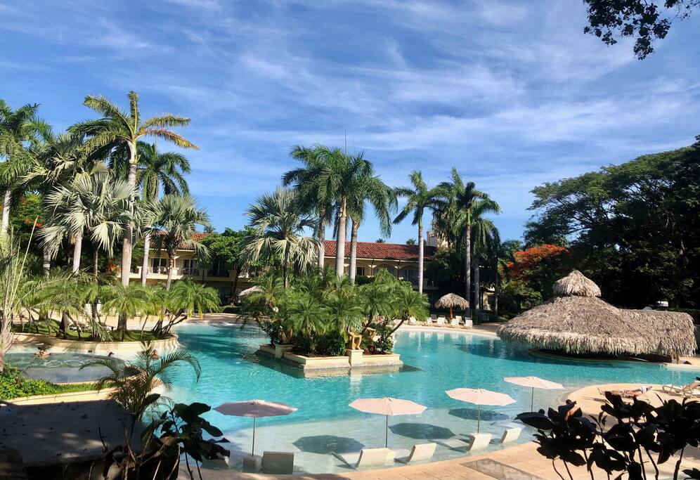 Below, an enormous swimming pool of organic design is the center of the garden area and boasts a swim up bar which you won’t want to miss. Across the street an oceanfront restaurant is preparing tropical delicacies to add sweetness and spice to the memories you will carry with you for a lifetime.