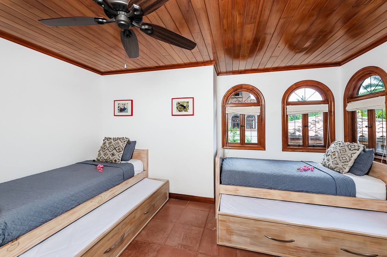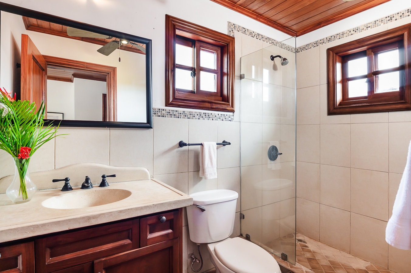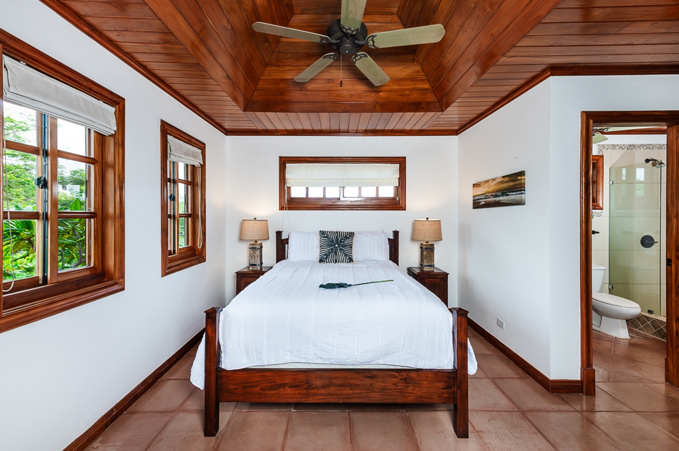 This spacious villa features three inviting bedrooms, each with its own en-suite bathroom. The master bedroom boasts a plush king-sized bed and direct access to a private balcony with breathtaking ocean views. The two guest bedrooms are equally well-appointed, one with a queen-sized bed and the other with twin beds, providing plenty of space for your family or group of friends.