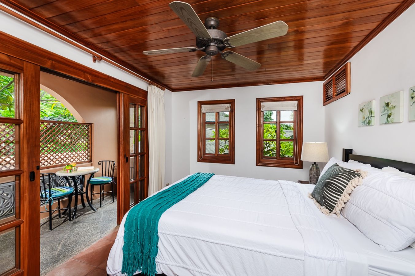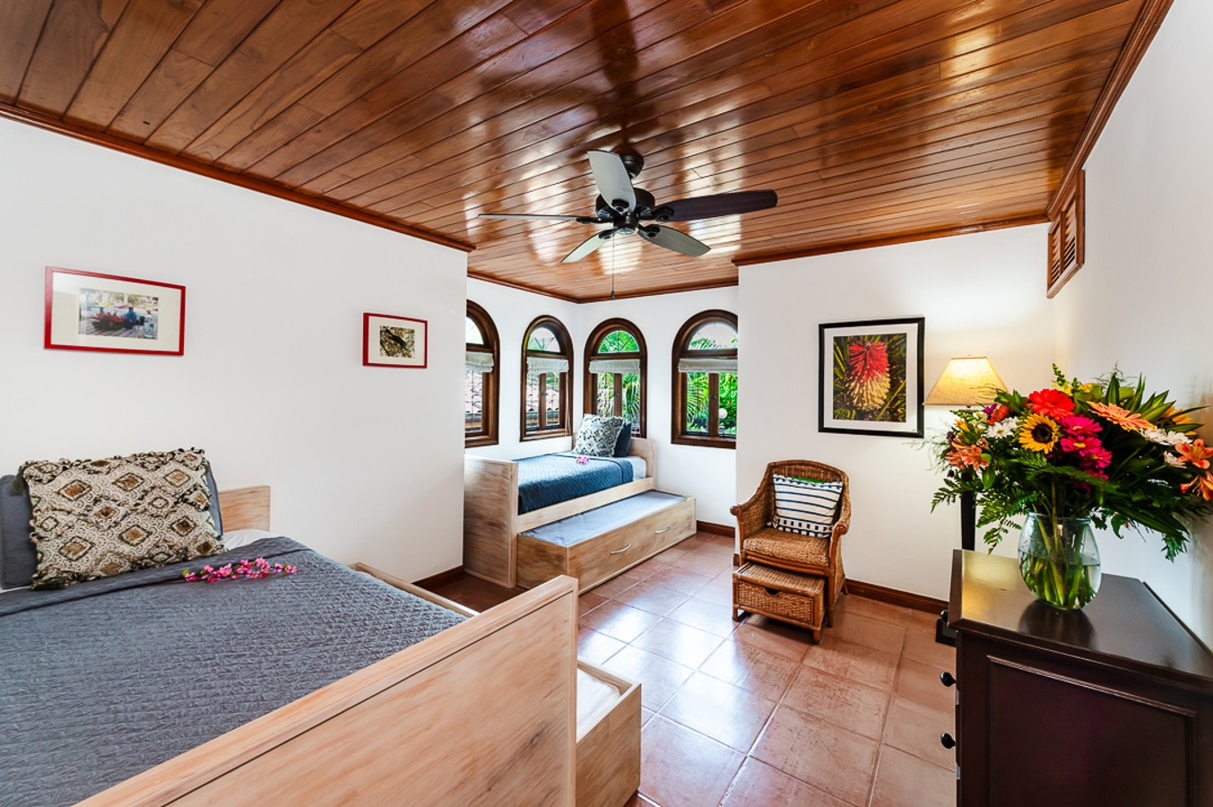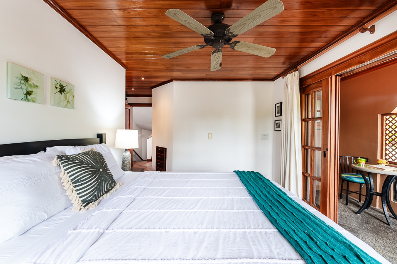 This spacious villa features three inviting bedrooms, each with its own en-suite bathroom. The master bedroom boasts a plush king-sized bed and direct access to a private balcony with breathtaking ocean views. The two guest bedrooms are equally well-appointed, one with a queen-sized bed and the other with twin beds, providing plenty of space for your family or group of friends.