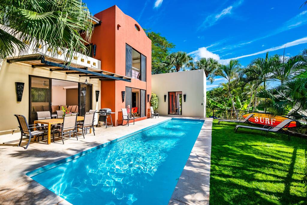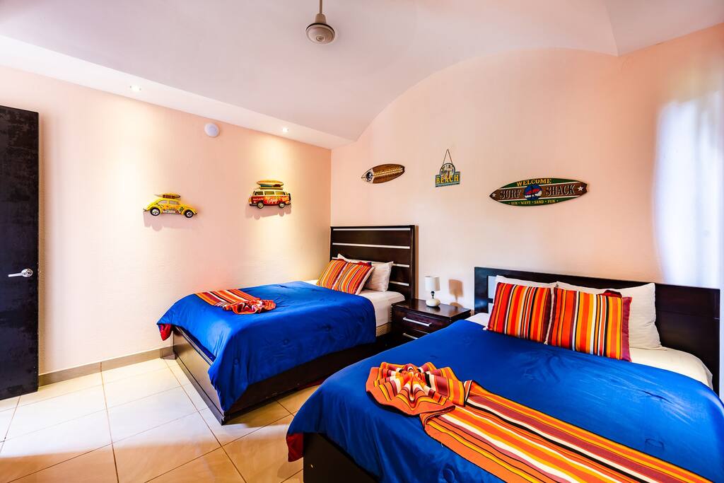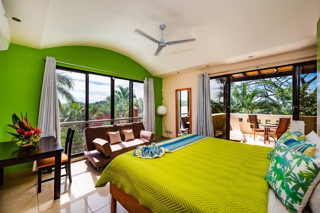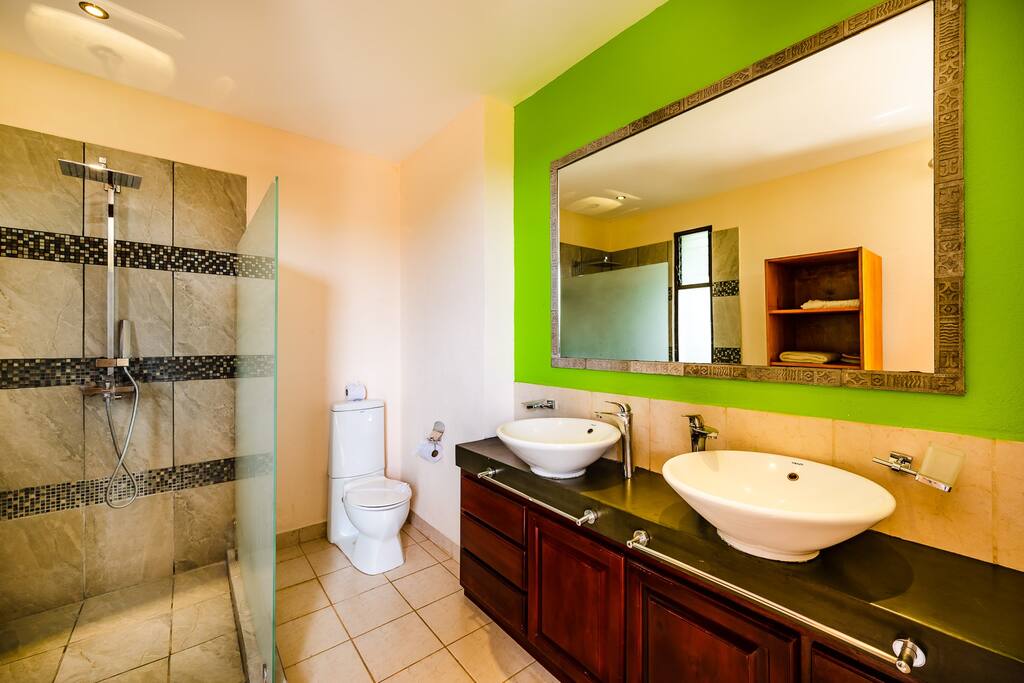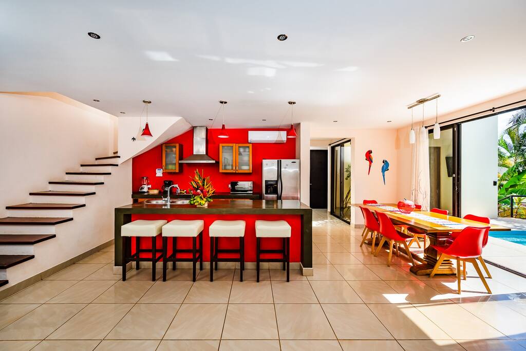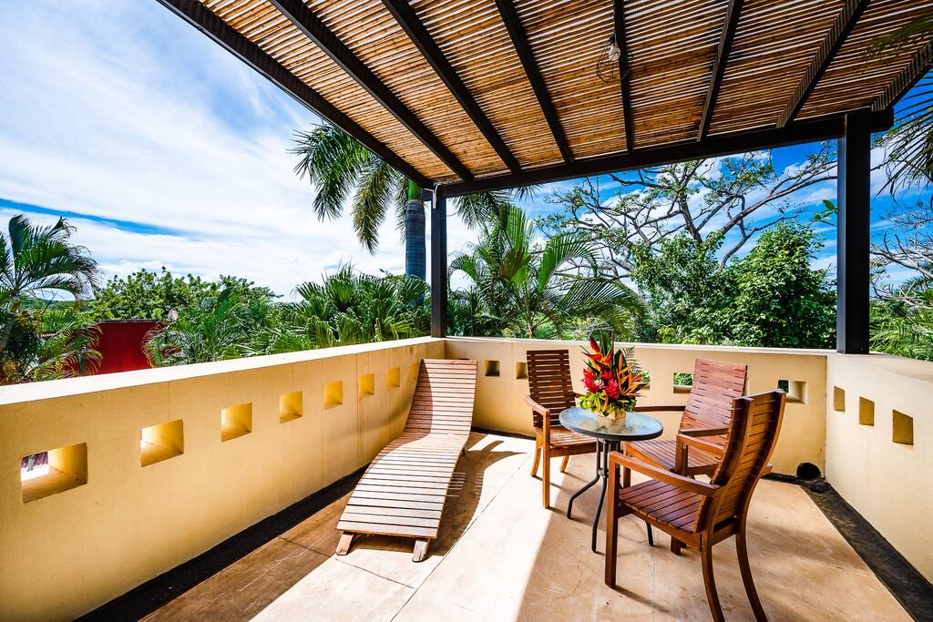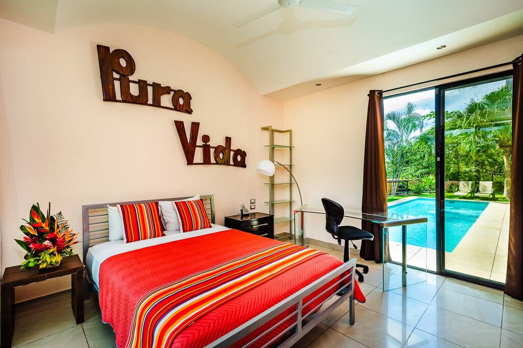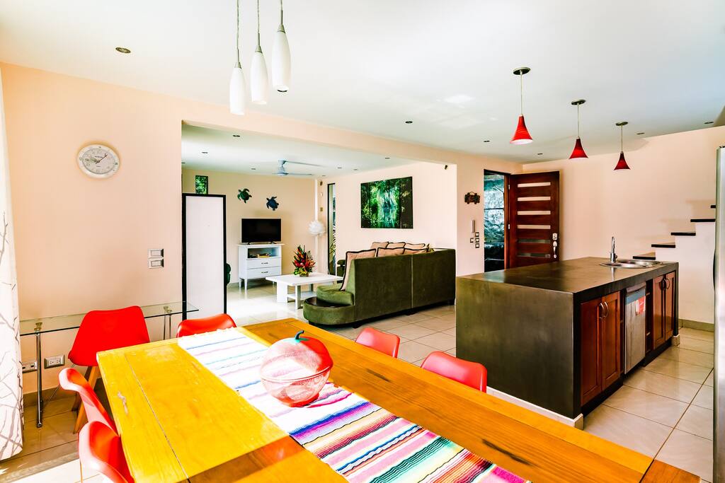 This modern home has 3 spacious bedrooms, each equipped with a full, ensuite bathroom, plus a half bathroom on the first floor for your convenience. Two of the bedrooms are considered “master bedrooms”; one is located on the second floor with a large private balcony to see the sunrise on the sounds of the howler monkeys, overlooking the surrounding hills of Tamarindo and the ocean; and the other is on the first floor with views on the pool and the backyard.