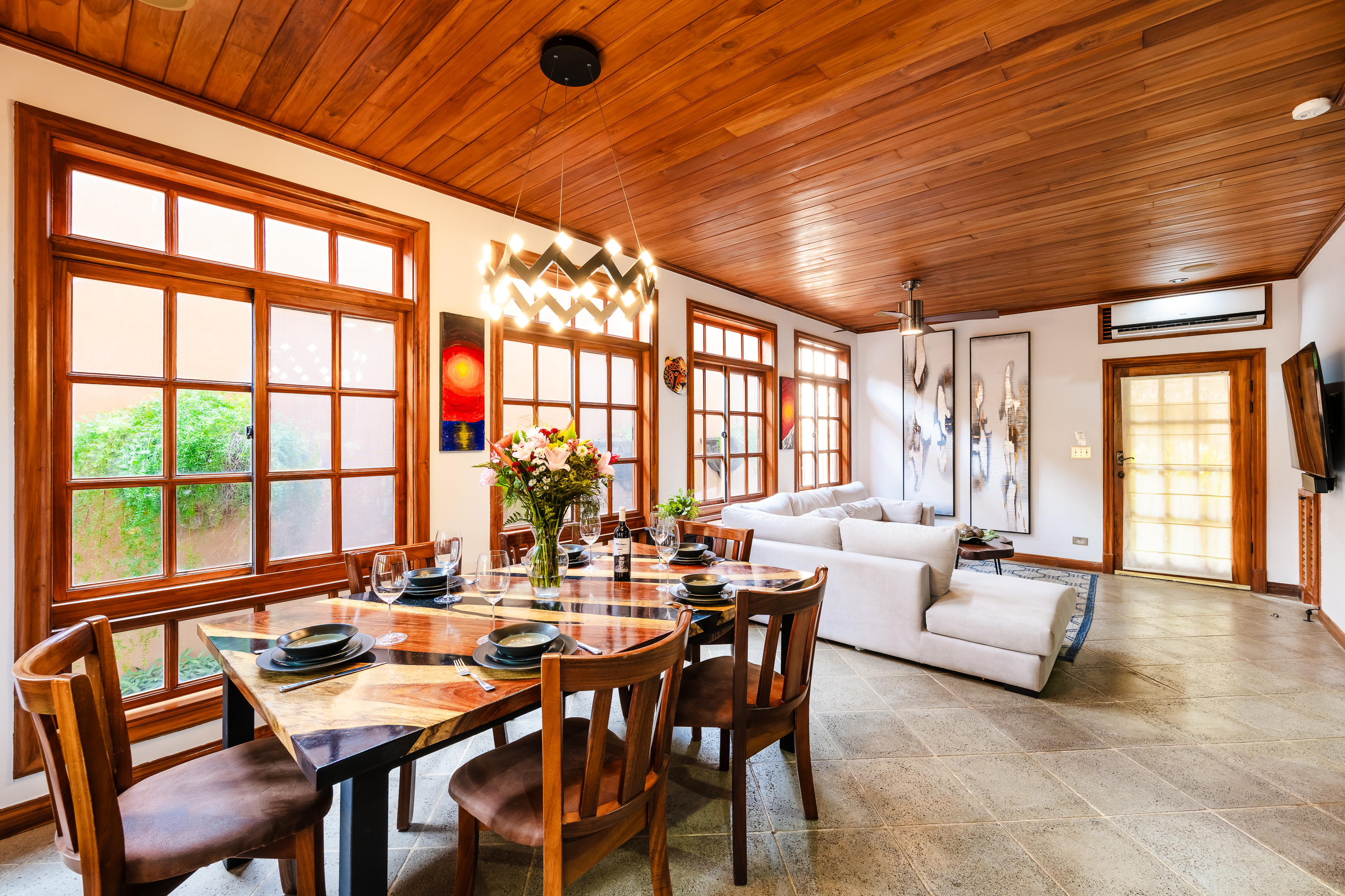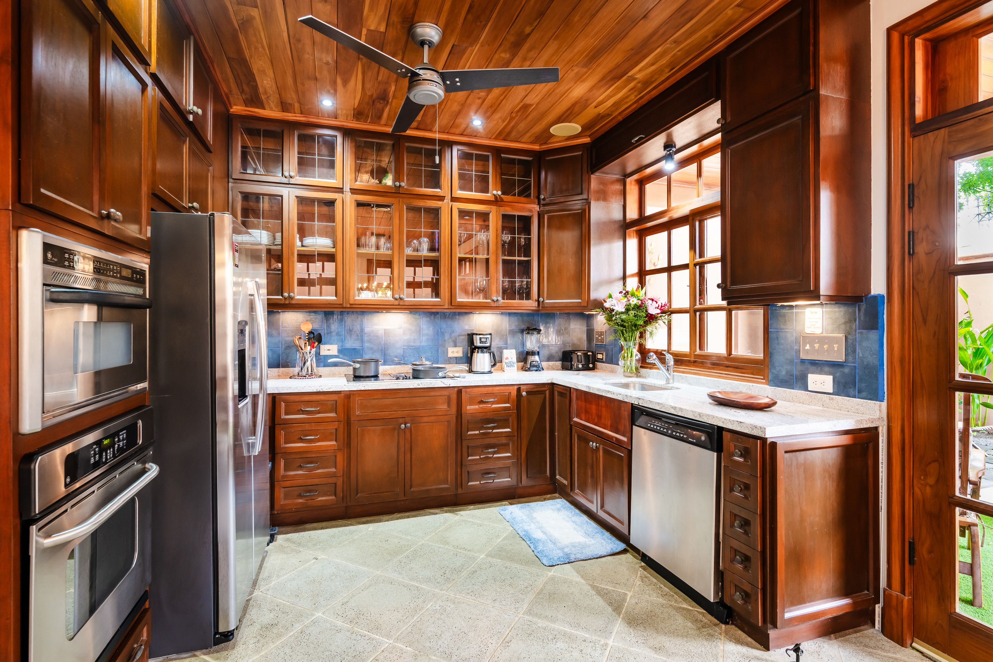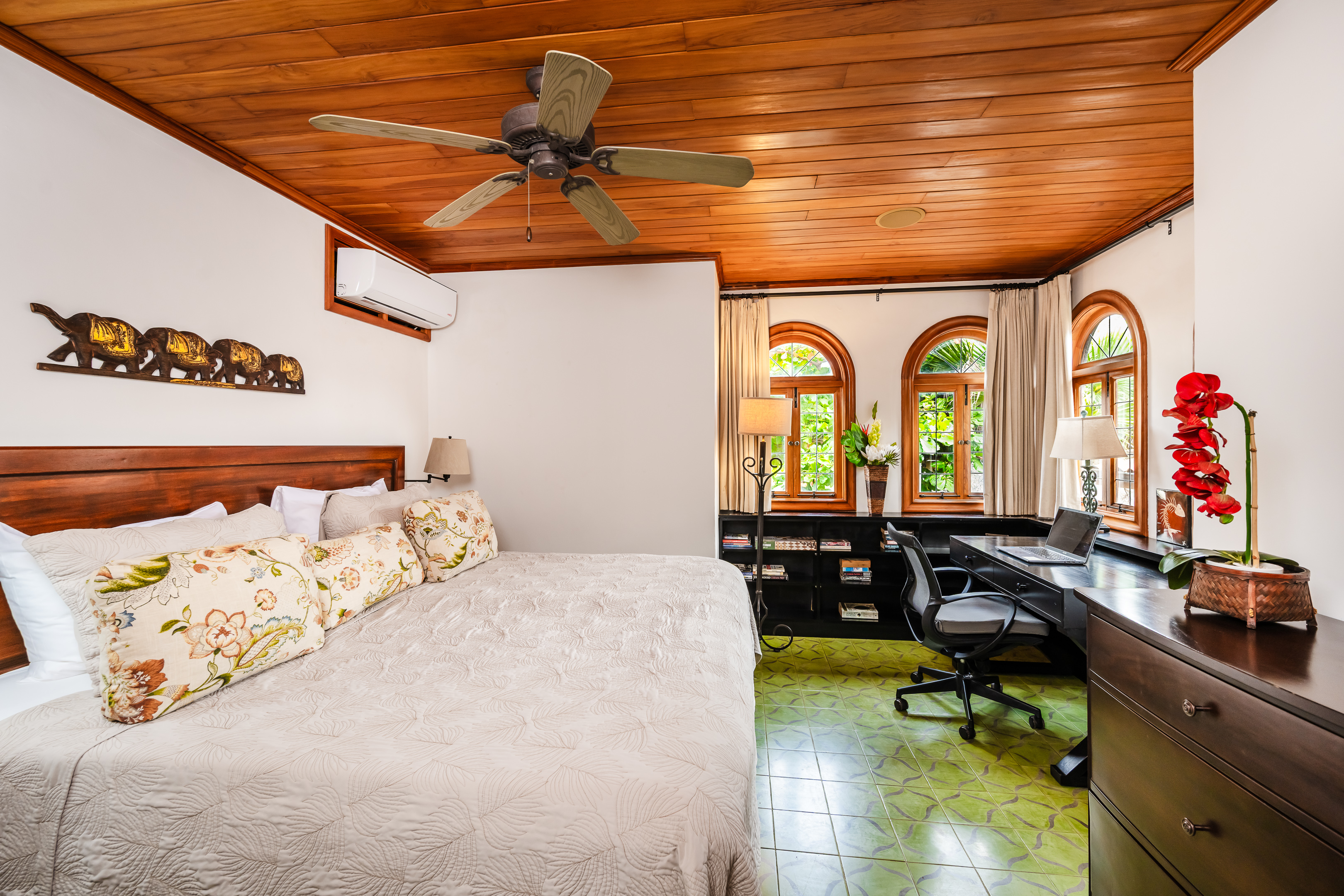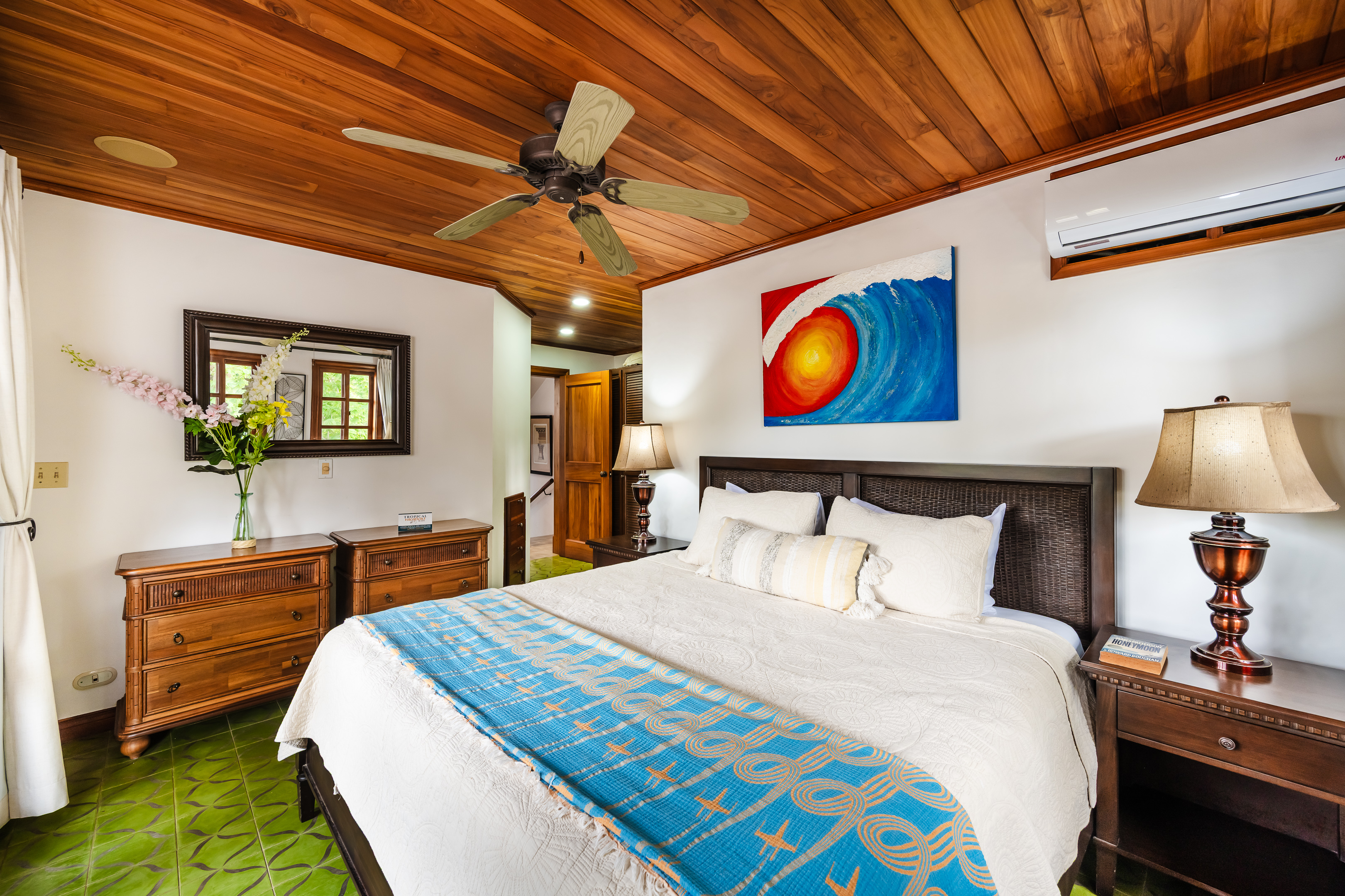 This Mediterranean style villa features three bedrooms, each with en suite bath, and blends natural exotic hardwoods with beautiful tiled floors. The villa is fully furnished with custom hand-crafted teak and Guanacaste furniture inside and out. Your vacation experience is further enhanced by a rear terrace with BBQ, and a sparkling private pool nestled within the villa’s private courtyard.