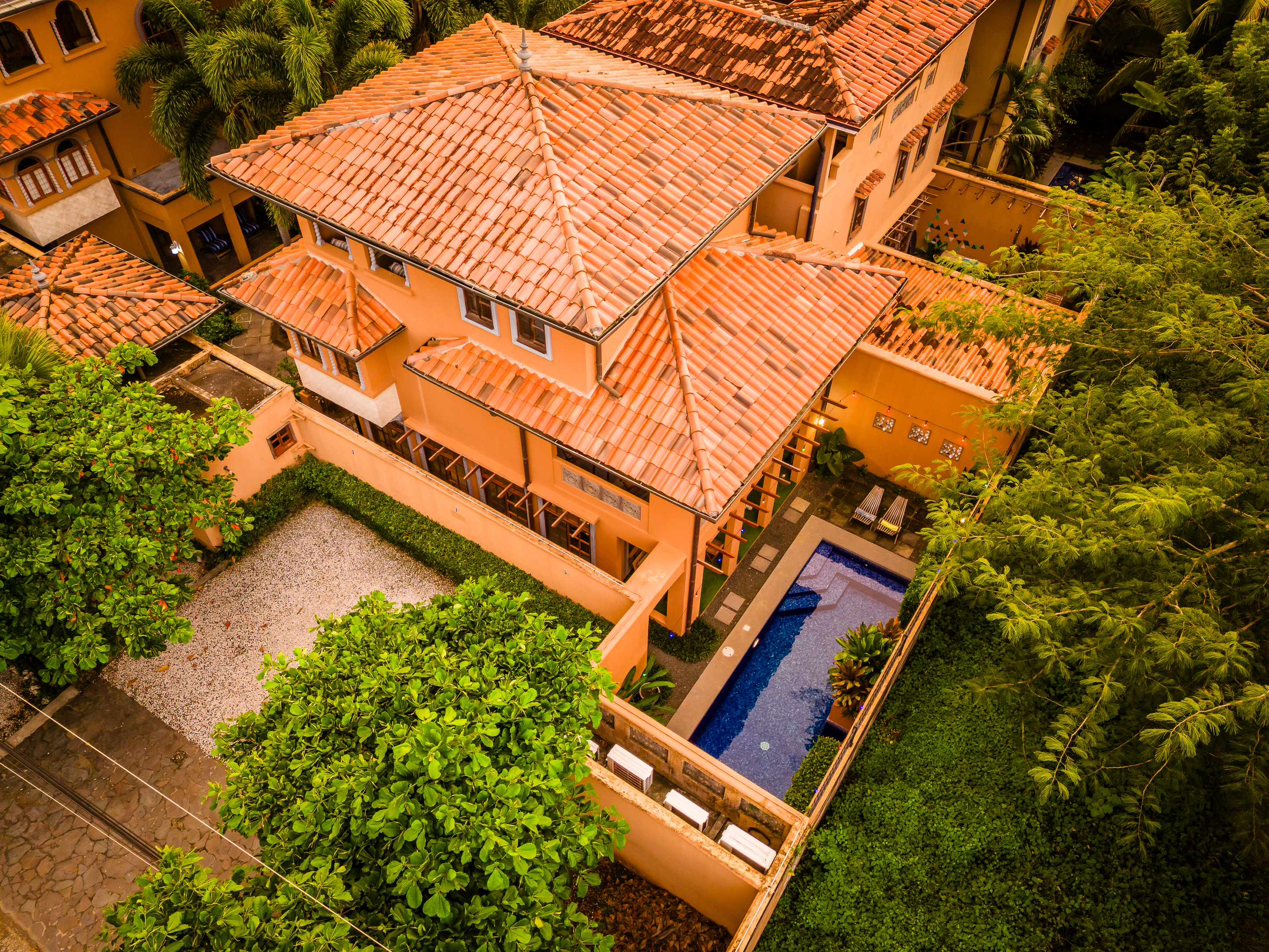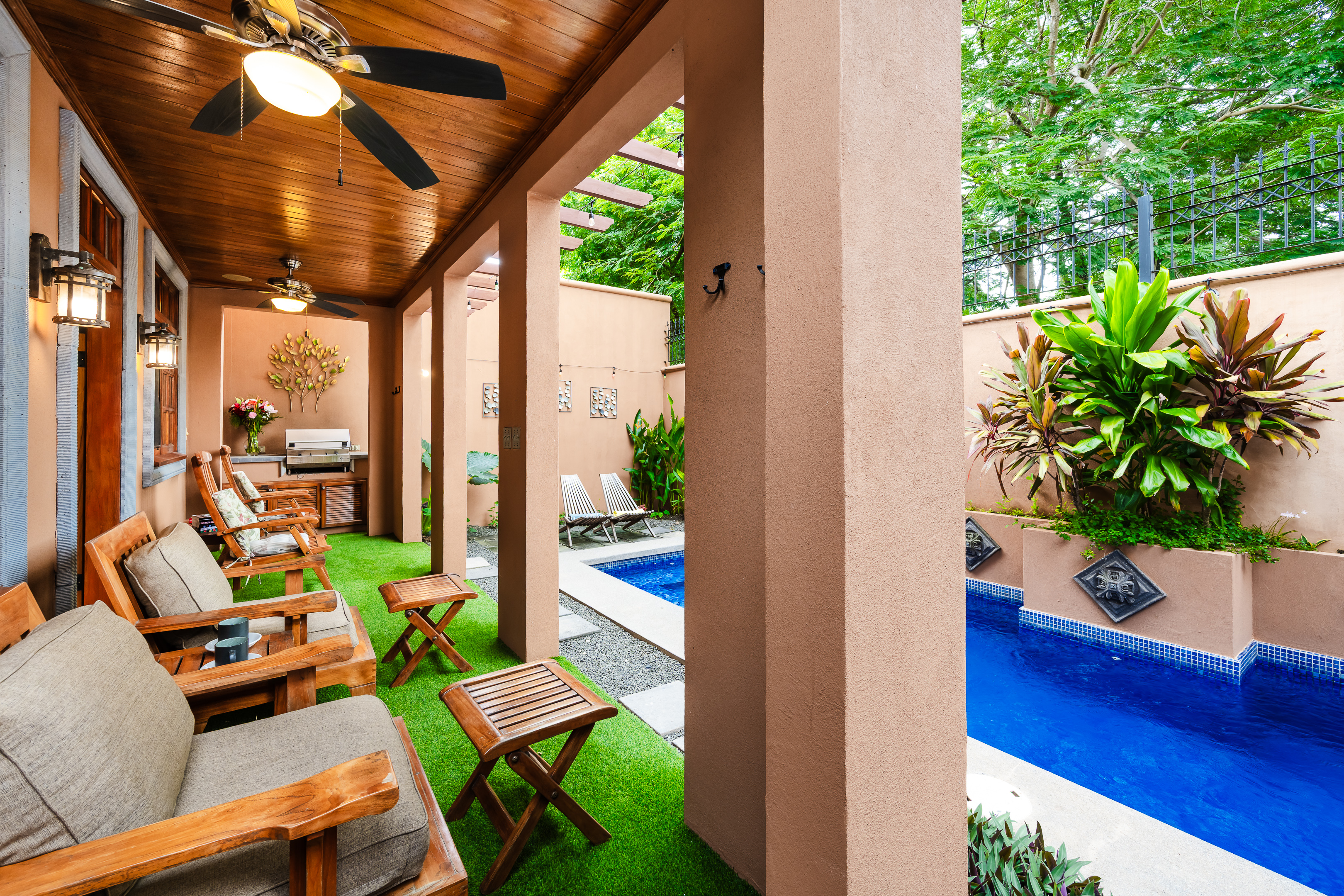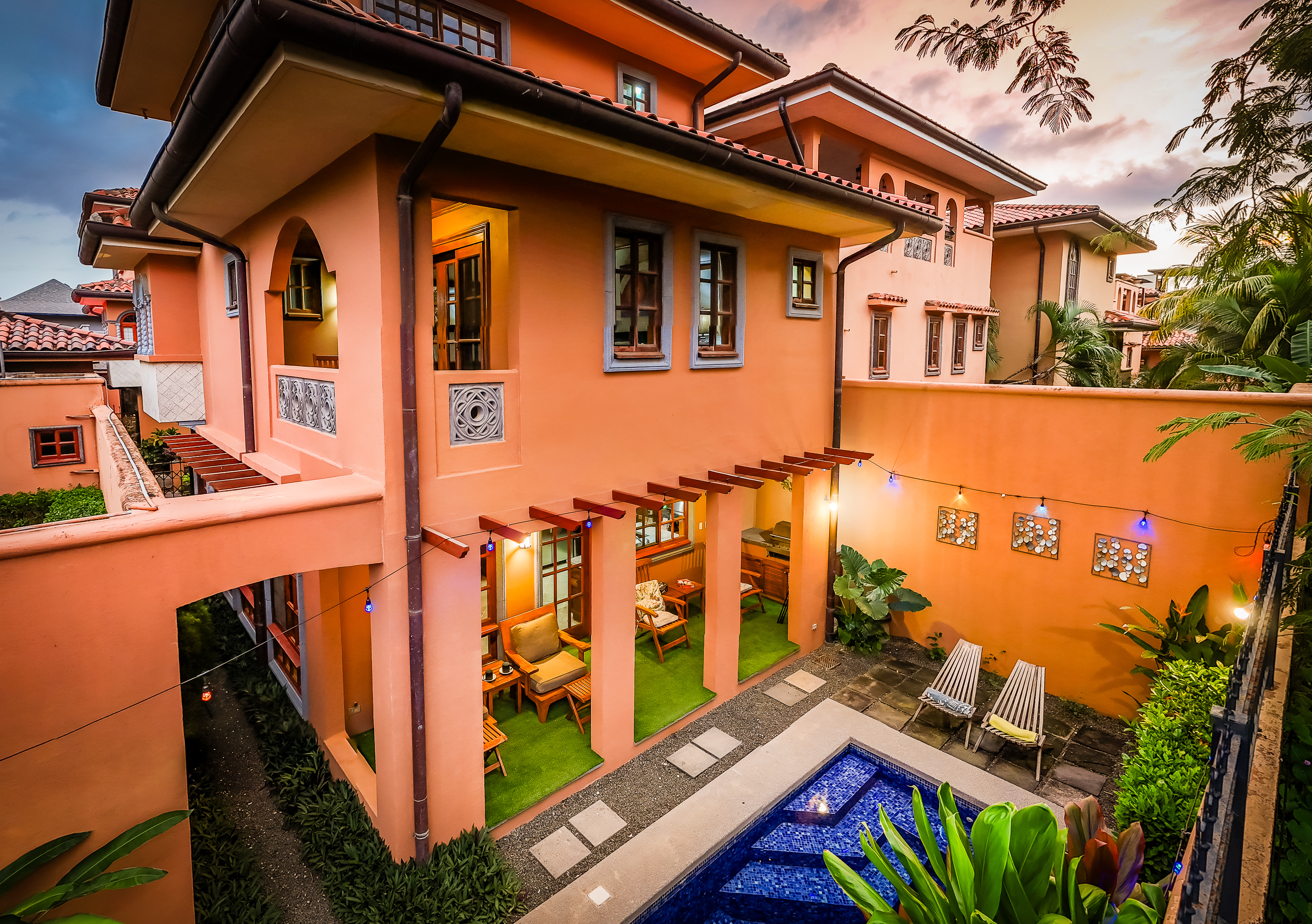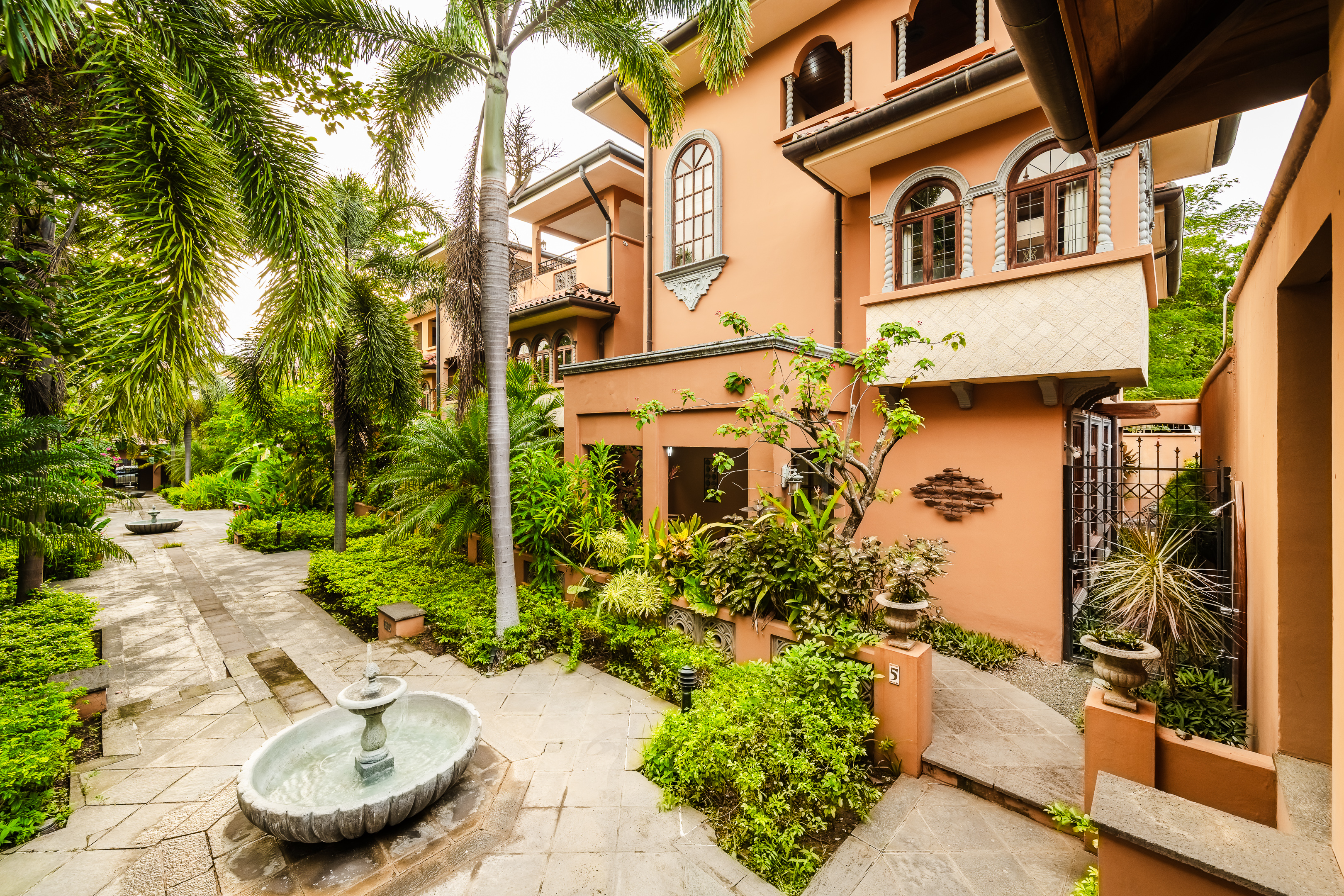 Enjoy a pura vida vacation at Courtyard Villa 5, a beautiful home in an exclusive gated community right across the street from secluded Langosta beach. Walk to restaurants and supermarkets in the neighborhood, and enjoy a private oasis just minutes away from the amazing shopping and dining in vibrant and bustling Tamarindo. The courtyard is graced by mature palm trees framing a lush piazza accented by fountains and flowering plants.