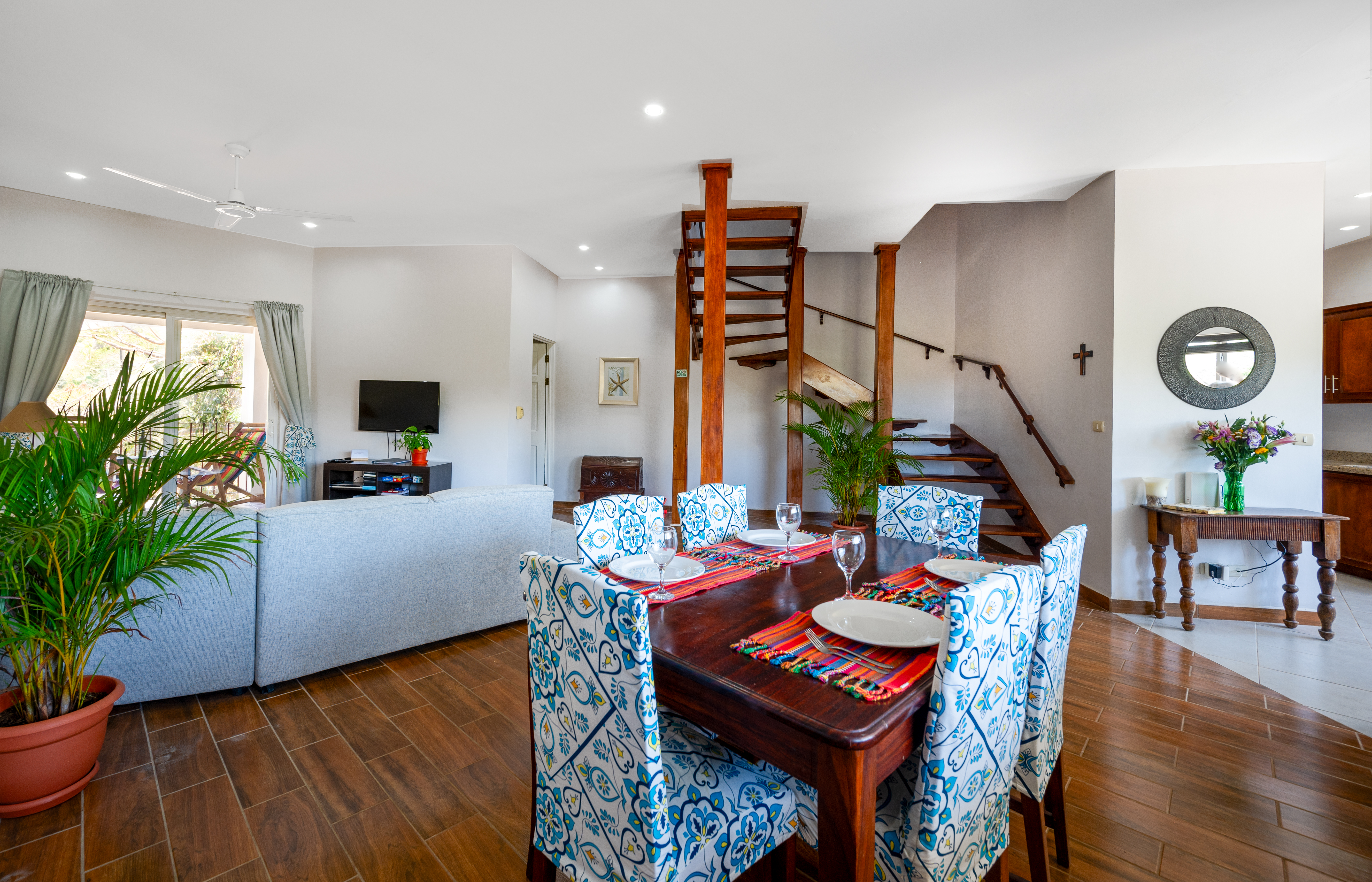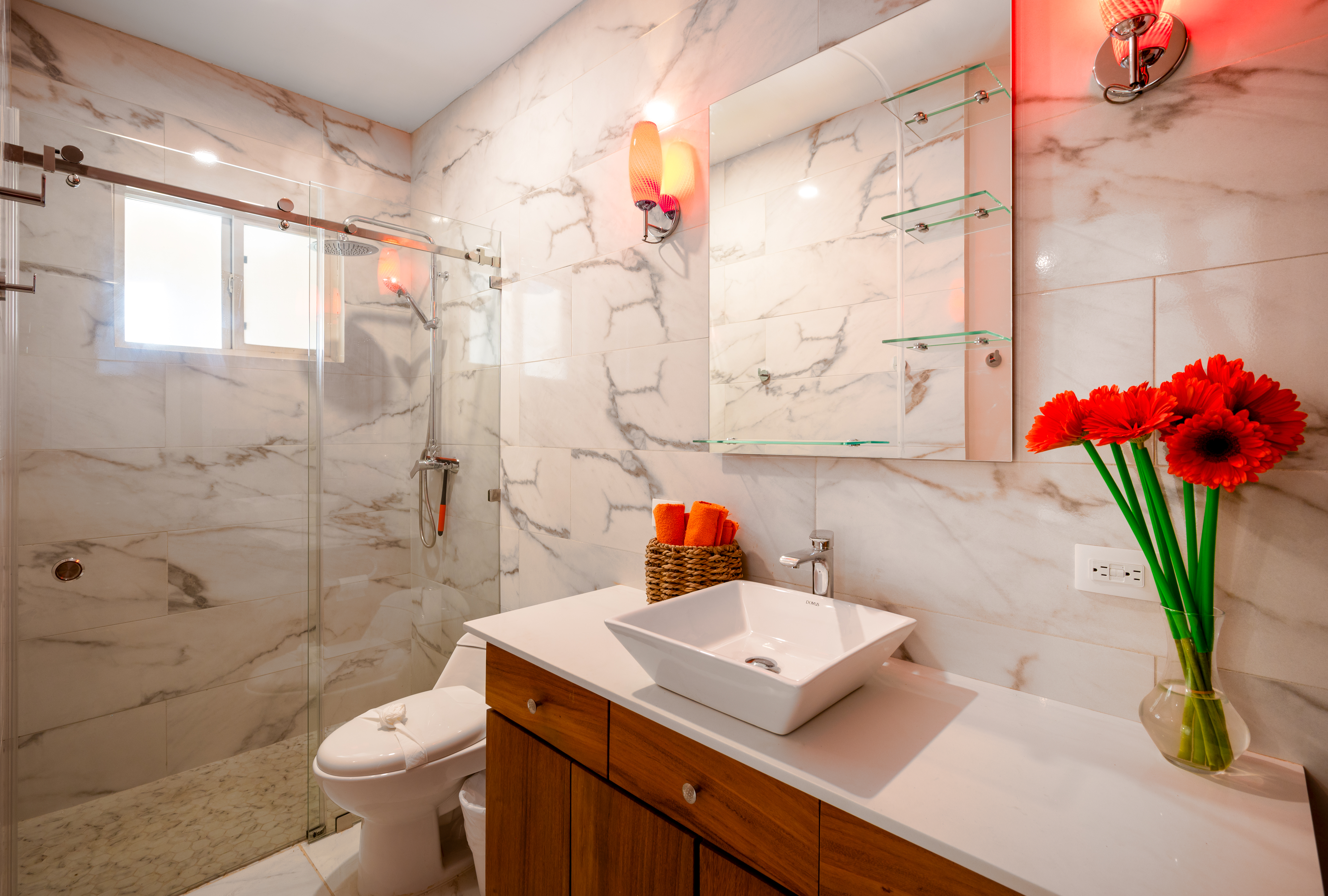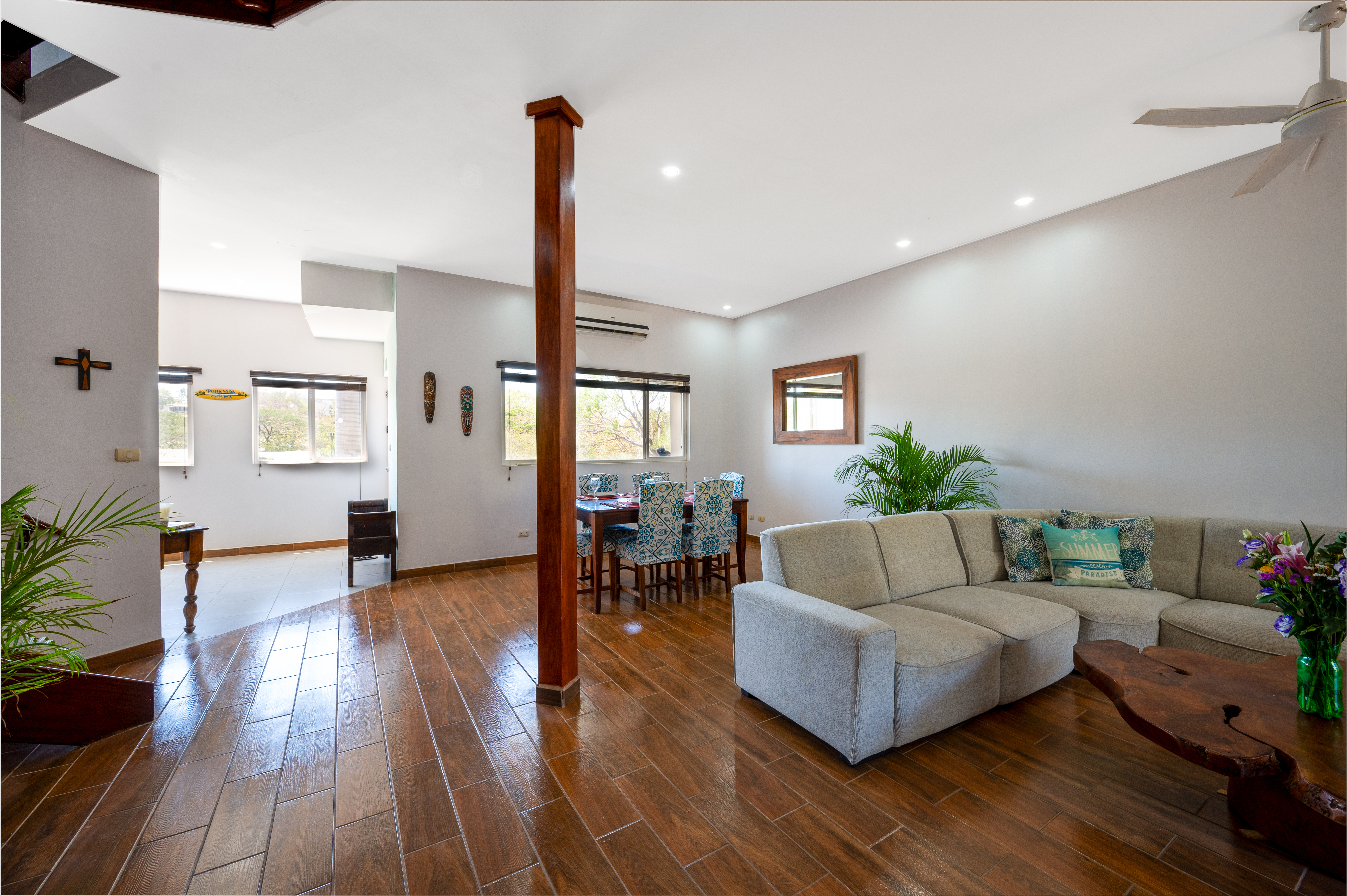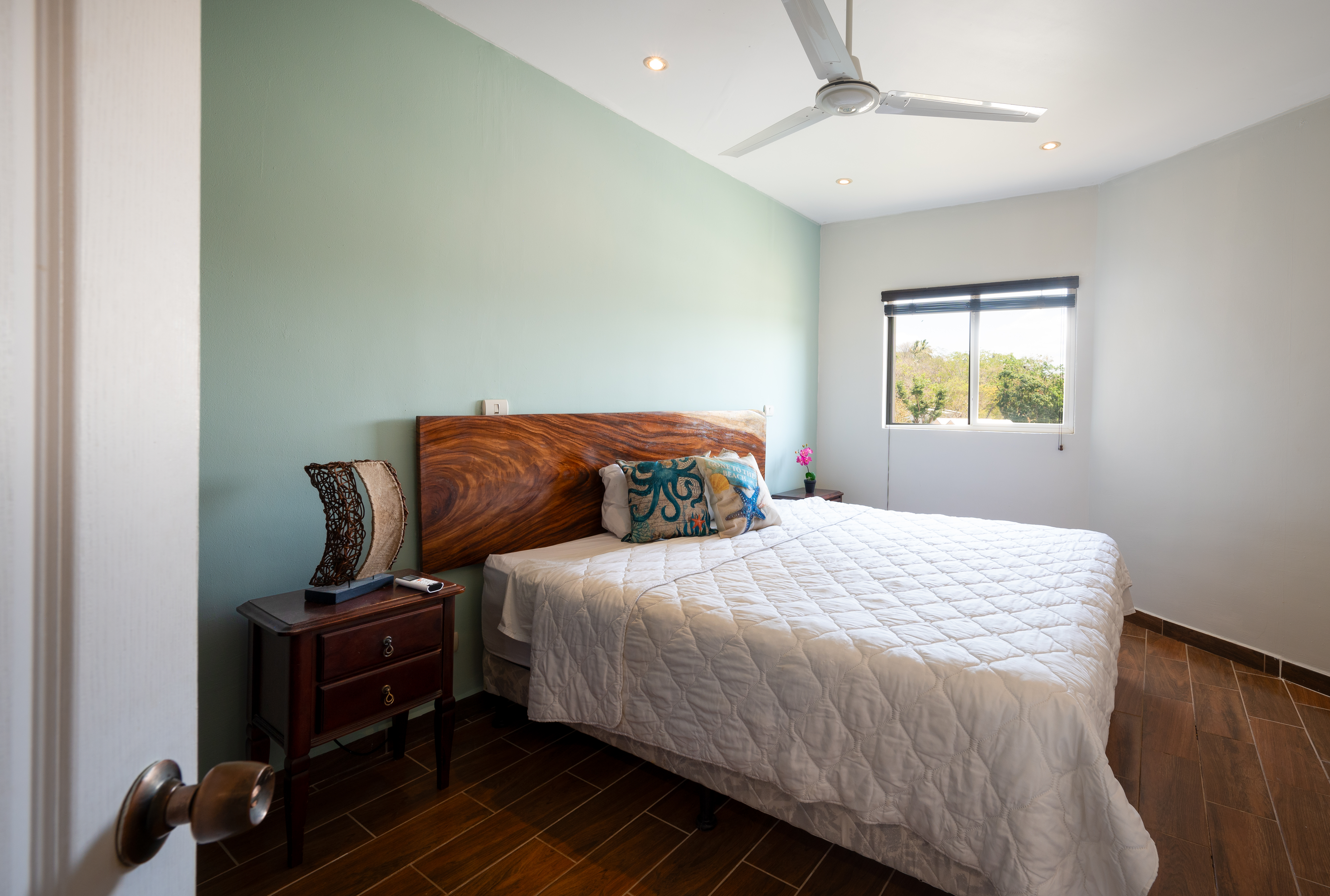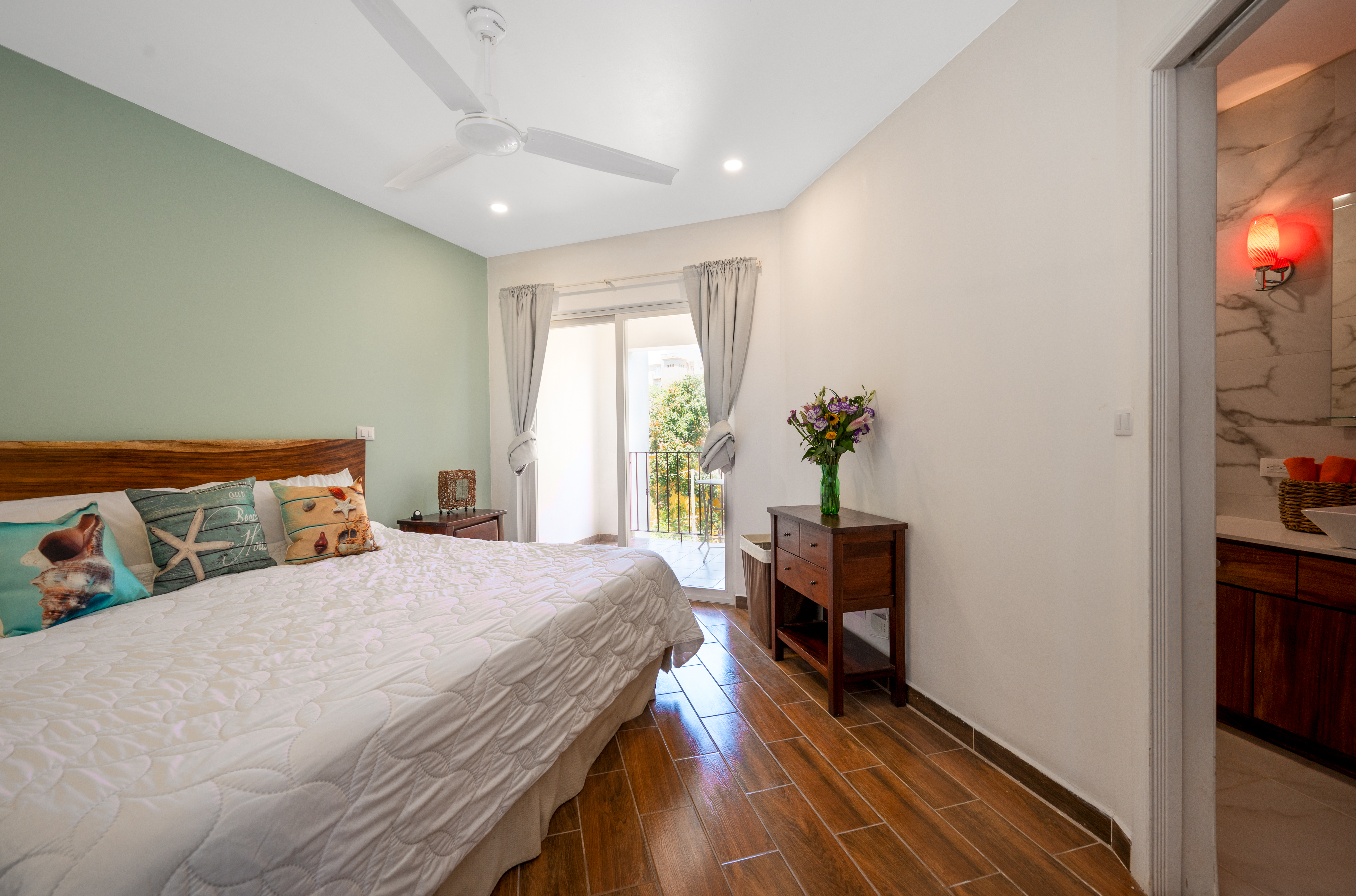 On the second floor, you have three spacious bedrooms. The master bedroom has a king size bed along with its own en-suite bathroom. Just outside the master bedroom there is a private terrace that overlooks the pool. The second and thrid bedrooms both have king sized beds and a shared bathroom. All bedrooms have AC and large closets.