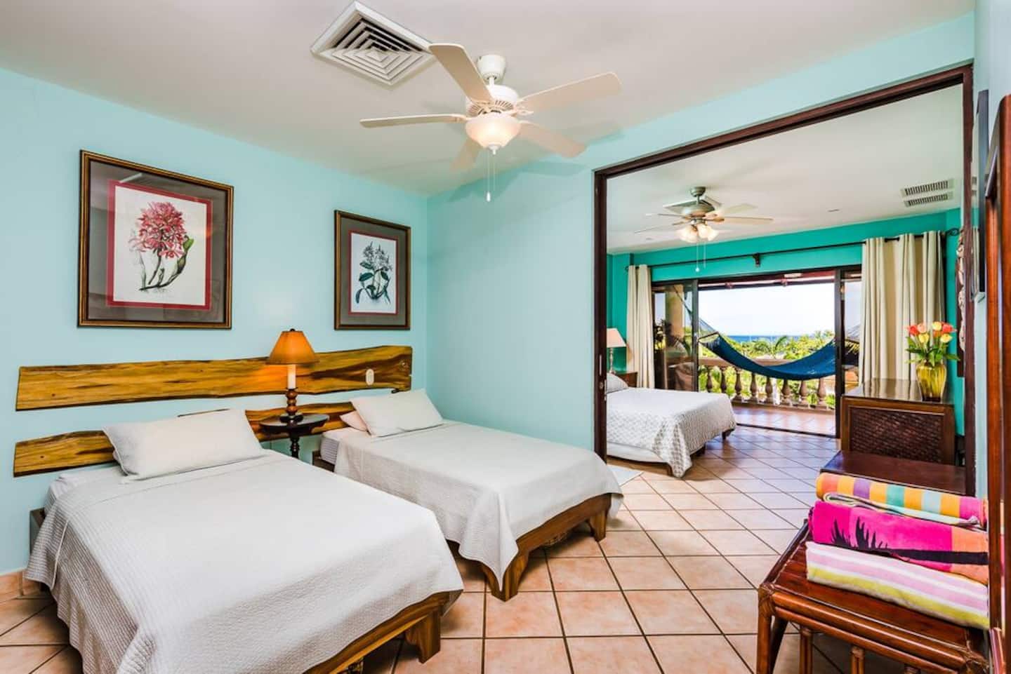 Just across the street from Playa Tamarindo, this wonderfully decorated condo combines ocean view, large free-form pool, and easy access to the center of Tamarindo with privacy and security. You’re just a short walk from the beach, grocery store, bank, shops, and many restaurants that Tamarindo has to offer. The large master bedroom opens to a balcony with ocean views that is perfect for enjoying the sunsets. There you will find a king sized bed plus 2 twin beds. In the living area you will find a,TV, DVD, and a Bose wave radio. Enjoy the sunset from your private ocean view patio – or perhaps catch a glimpse of Howler Monkeys, parrots, or other exotic birds in the trees surrounding the complex.